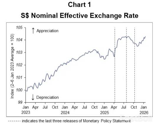 أعلنت هيئة النقد السنغافورية، في أول مراجعة لسياساتها النقدية لهذا العام، أنها ستُبقي على معدل ارتفاع سعر الصرف الفعلي الاسمي للدولار السنغافوري (S$NEER) ضمن النطاق المحدد. وأكد البنك المركزي أنه "لن يطرأ أي تغيير على عرض النطاق أو المستوى الذي يتمركز عنده".