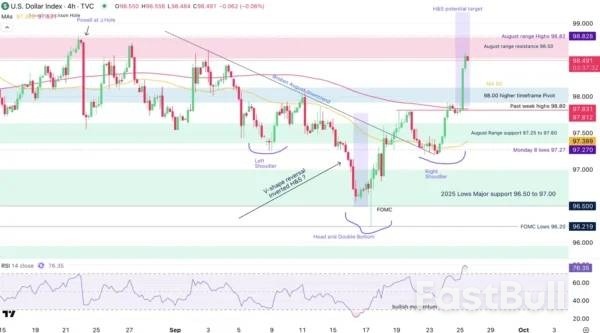 بعد أسبوع من شمعة اللجنة الفيدرالية للسوق المفتوحة، تم تأكيد القاع المزدوج من خلال حركة السعر التالية: ارتفع مؤشر الدولار الأمريكي بنسبة 2.42% منذ تسجيل أدنى مستوياته الجديدة لعام 2025 عند 96.20. وقد اخترق أداء اليوم الضخم بنسبة +0.70% بسهولة أعلى المستويات السابقة ويتجه الآن لاختبار أعلى مستويات 1 أغسطس (قبل الفشل الكبير في تقرير الوظائف غير الزراعية في يوليو). سيكون لحركة السعر القادمة تأثير كبير على الأصول الأخرى، وخاصة في حالة اختراق الدولار. وقد تشكل نموذج الرأس والكتفين وسيخبرنا الوقت ما إذا كان سيكتمل - ويبدو أن الأساسيات تتوافق مع هذا الموضوع في الوقت الحالي.