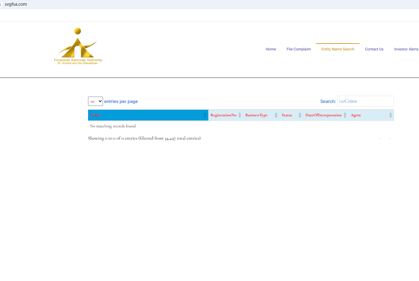 BrokersView found that the domain "https://121coinx.com/" is currently inaccessible. 121Coinx previously claimed to be registered with the St. Vincent and the Grenadines Financial Services Authority (SVG FSA), a search reveals the result no longer exists. Entrusting investor funds to this company is extremely risky due to the lack of legal safeguards. 121Coinx is a scam.