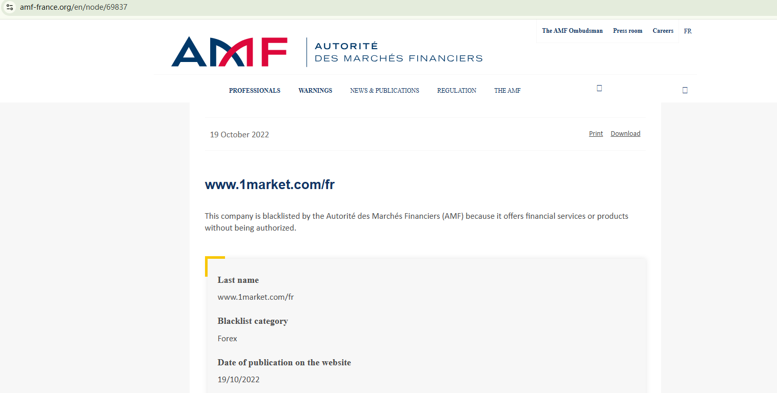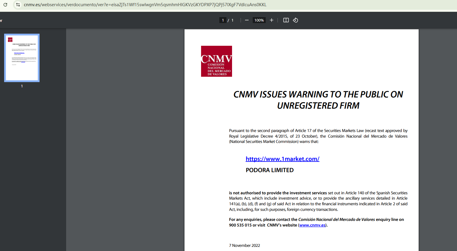 1markets' license from the Cyprus Securities and Exchange Commission (CySEC) was canceled. The domain of the broker seems to have been sold, because the content provide by the link was changed and unrelated. In addition, the Comisión Nacional del Mercado de Valores (CNMV) and the Autorité des marchés financiers (AMF) have issued warnings about 1markets for carrying on unlicensed investment activities. All the signs indicate that 1markets poses substantial risks. Investors should exercise extreme caution about this potential scam.