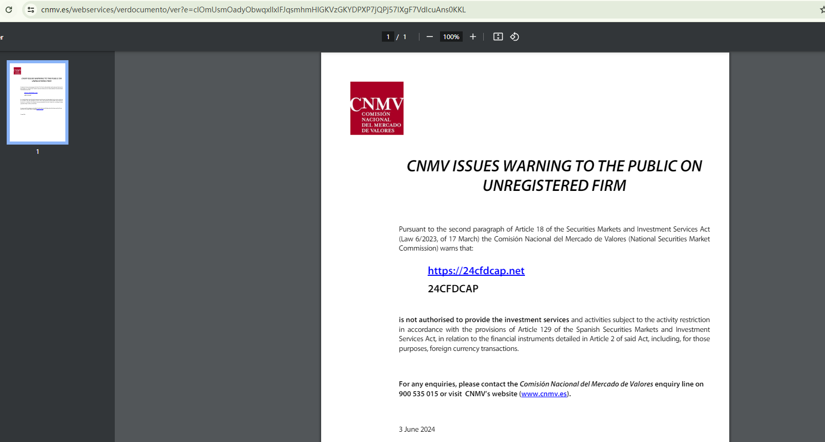 The broker's website conspicuously lacks any regulatory information, a telltale sign of a scam. Furthermore, the Comisión Nacional del Mercado de Valores (CNMV) has issued a warning against 24 CFDCAP for offering investment services without proper authorization. This warning serves as further evidence that the company is not in compliance with relevant regulations.