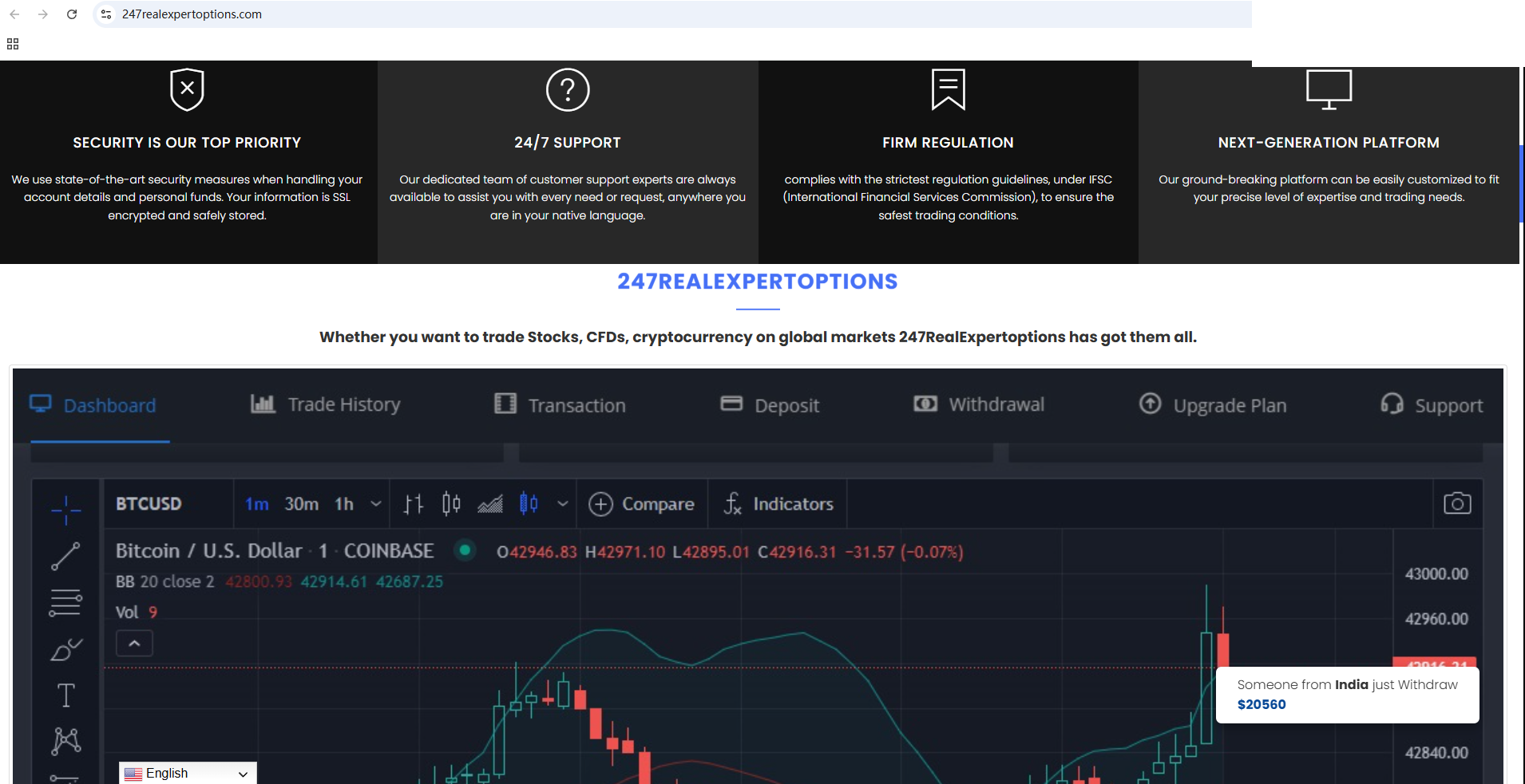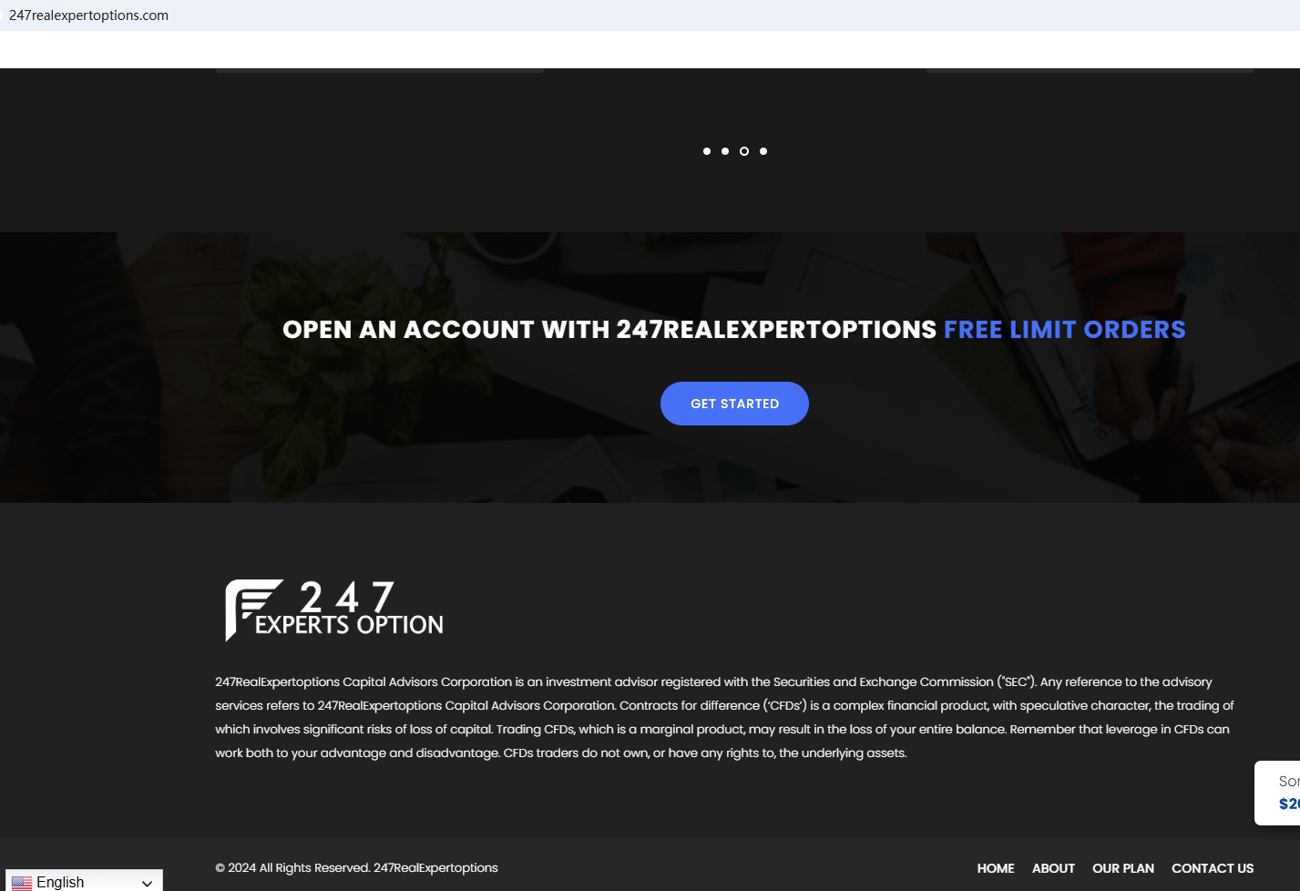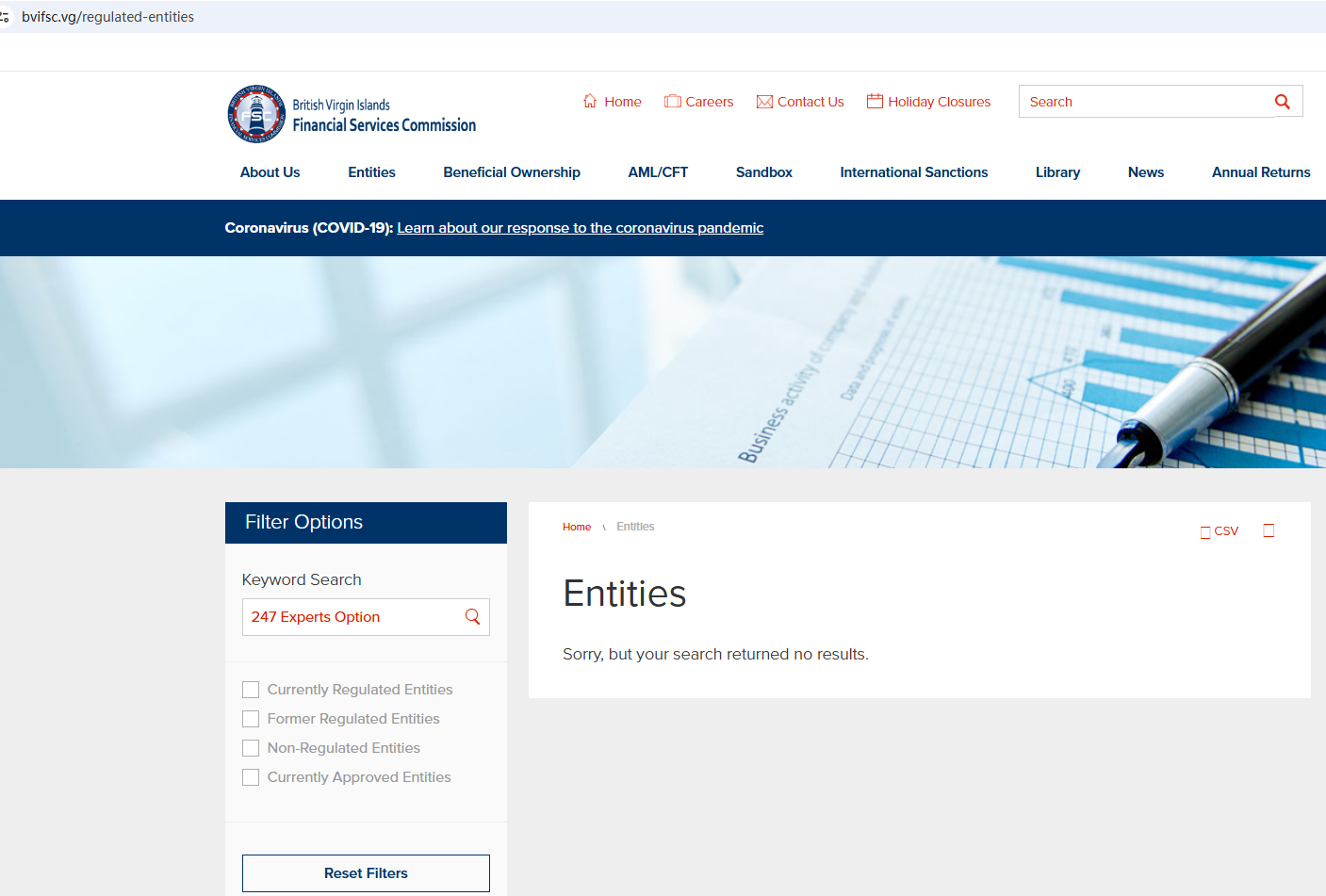According to its website, it is regulated by the British Virgin Islands Financial Services Commission (BVI FSC), but a search of the BVI FSC found no matching information. It also mentions registration with the U.S. Securities and Exchange Commission (US SEC) at the bottom of its website; however, it is well known that the SEC does not have the authority to regulate foreign exchange. In addition, the Financial Conduct Authority (FCA) issued a warning regarding 247 Experts Option, suspecting that this company may be offering financial services or products without the necessary authorization.