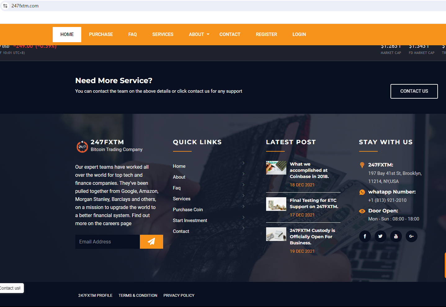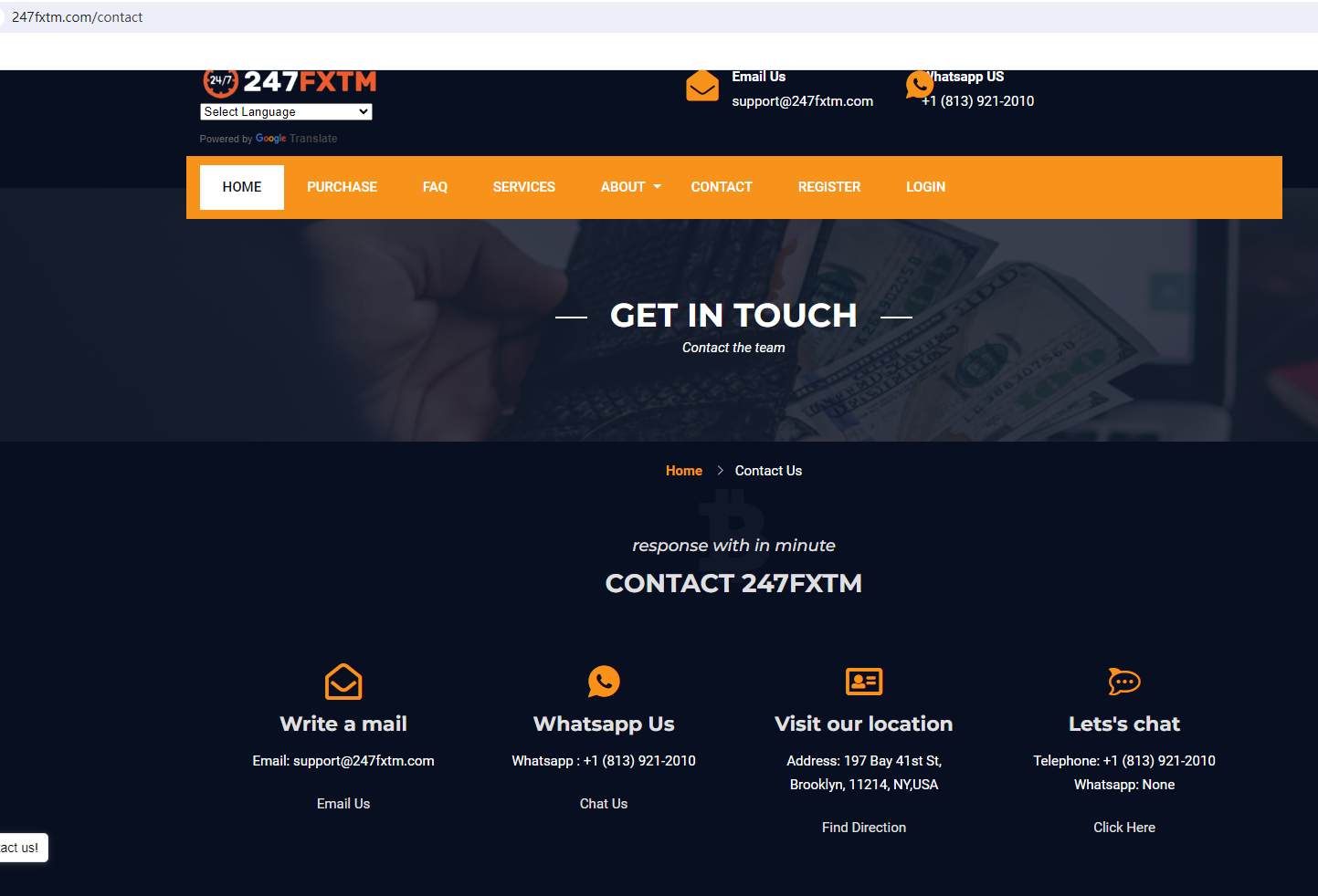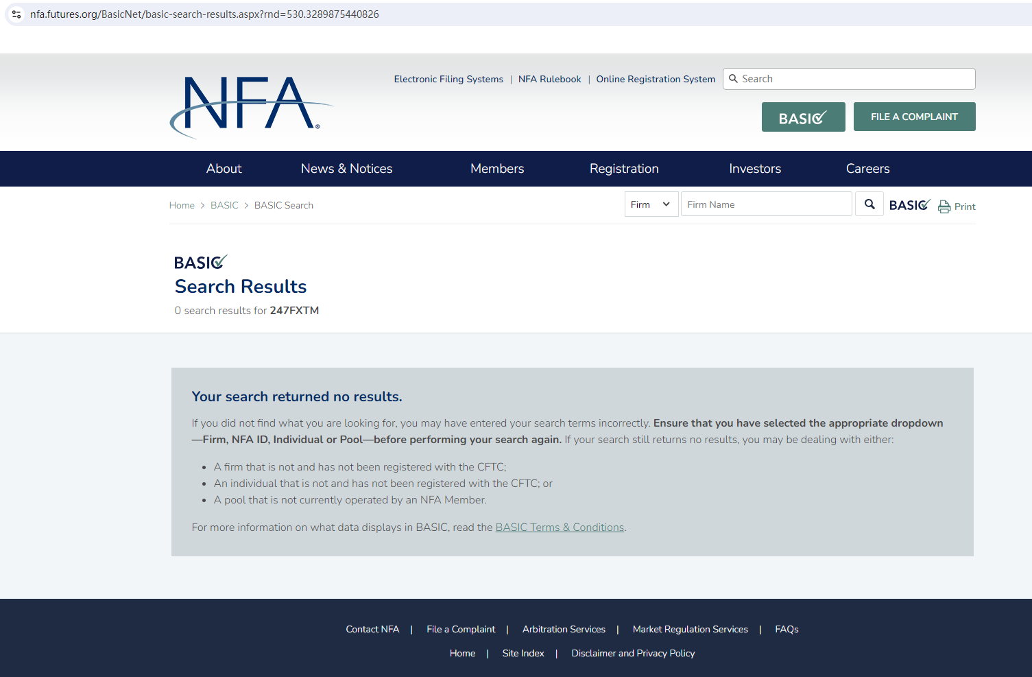According to its website, it is located in the U.S. Upon investigation, no matching information was found in the National Futures Association (NFA).In essence, 247FXTM is not regulated by any governing body. Entrusting it with investors' funds is highly risky, as there are no legal protections in place to safeguard the funds.247FXTM appears to be a scam.