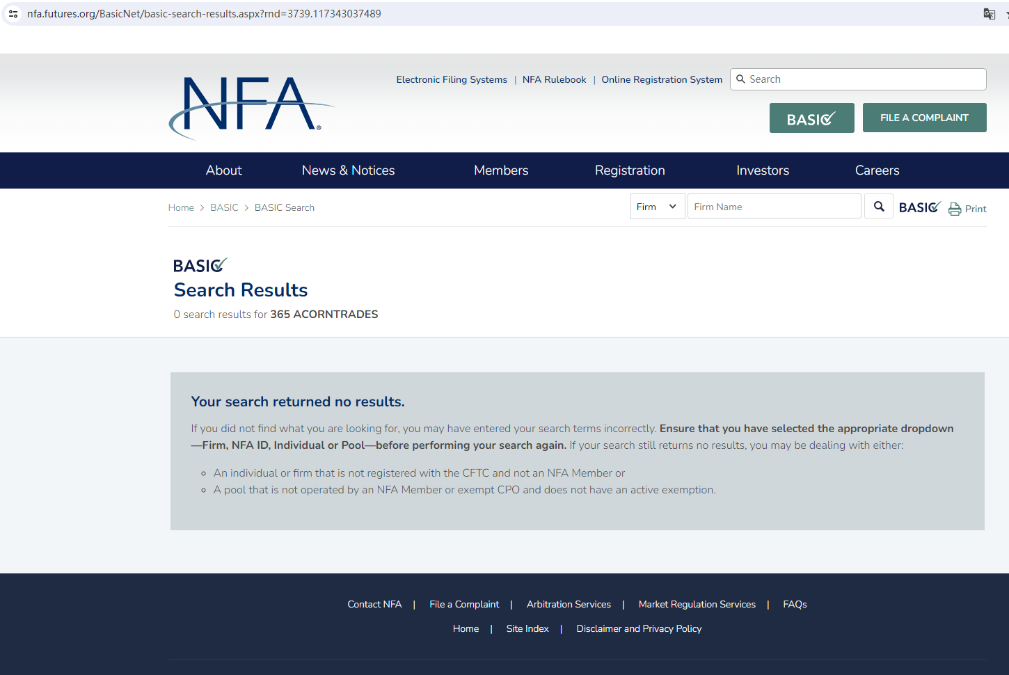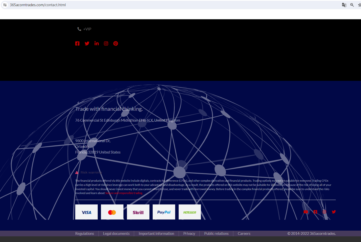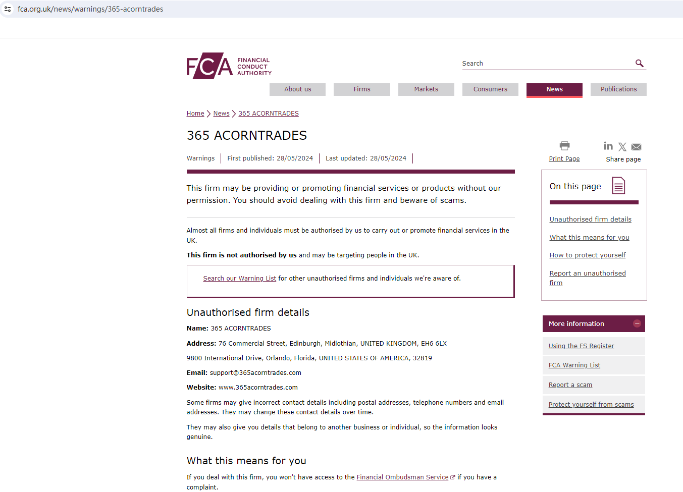 It claims to have two office addresses. One is in the UK and the other is in the USA. Upon investigation, no matching information was found in the National Futures Association (NFA). In addition, the United Kingdom Financial Conduct Authority (UK FCA) issued a warning that 365 ACORNTRADES was providing financial services or products in the UK without authorisation.