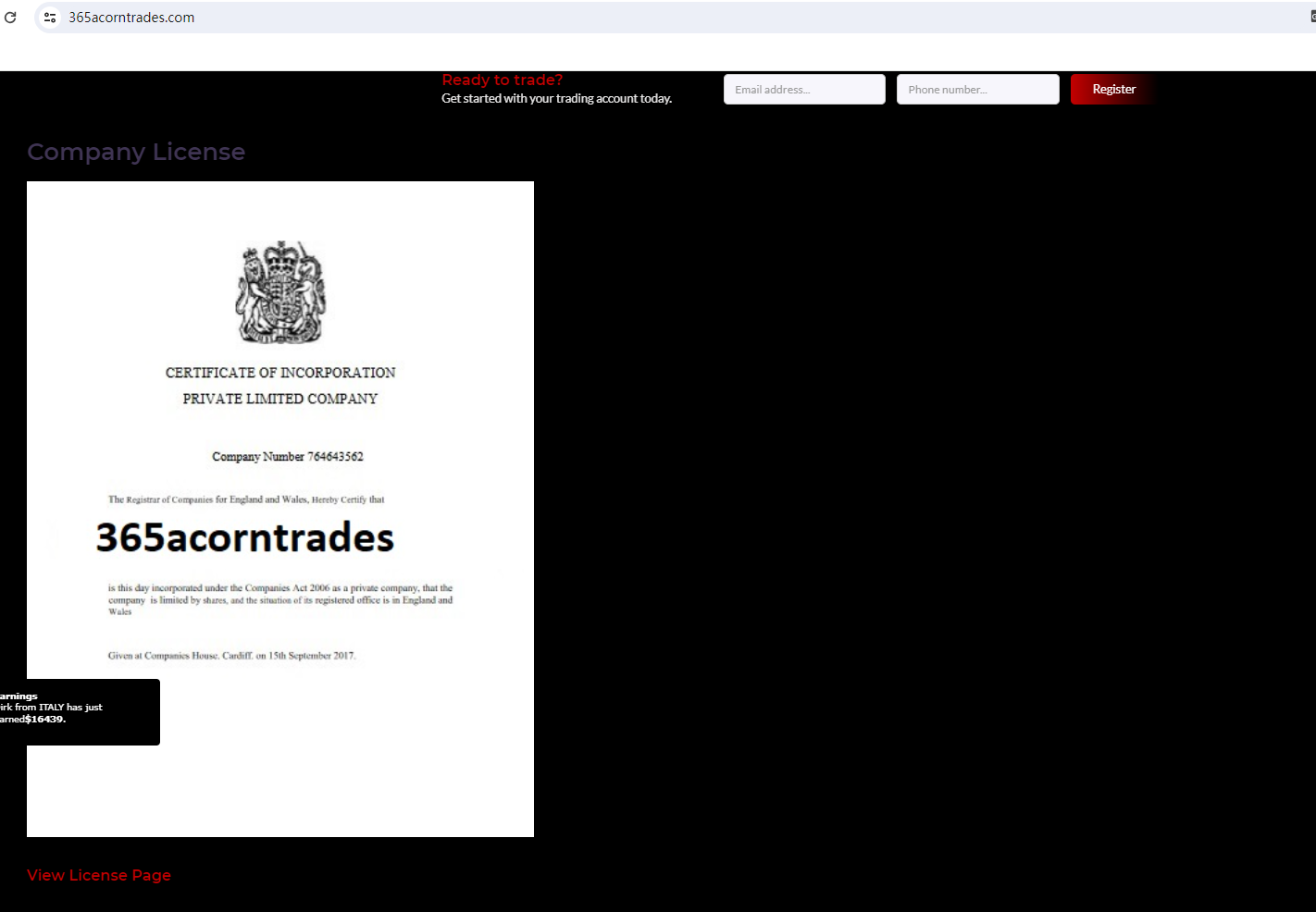 Intriguingly, 365 ACORNTRADES alleges to be registered with the Companies House (CH), under certificate number 764643562 and the company name 365 ACORNTRADES. However, no matching information was found in the CH. As such, Marketforetrading's so-called CH registration has ironically become proof of its dishonesty.