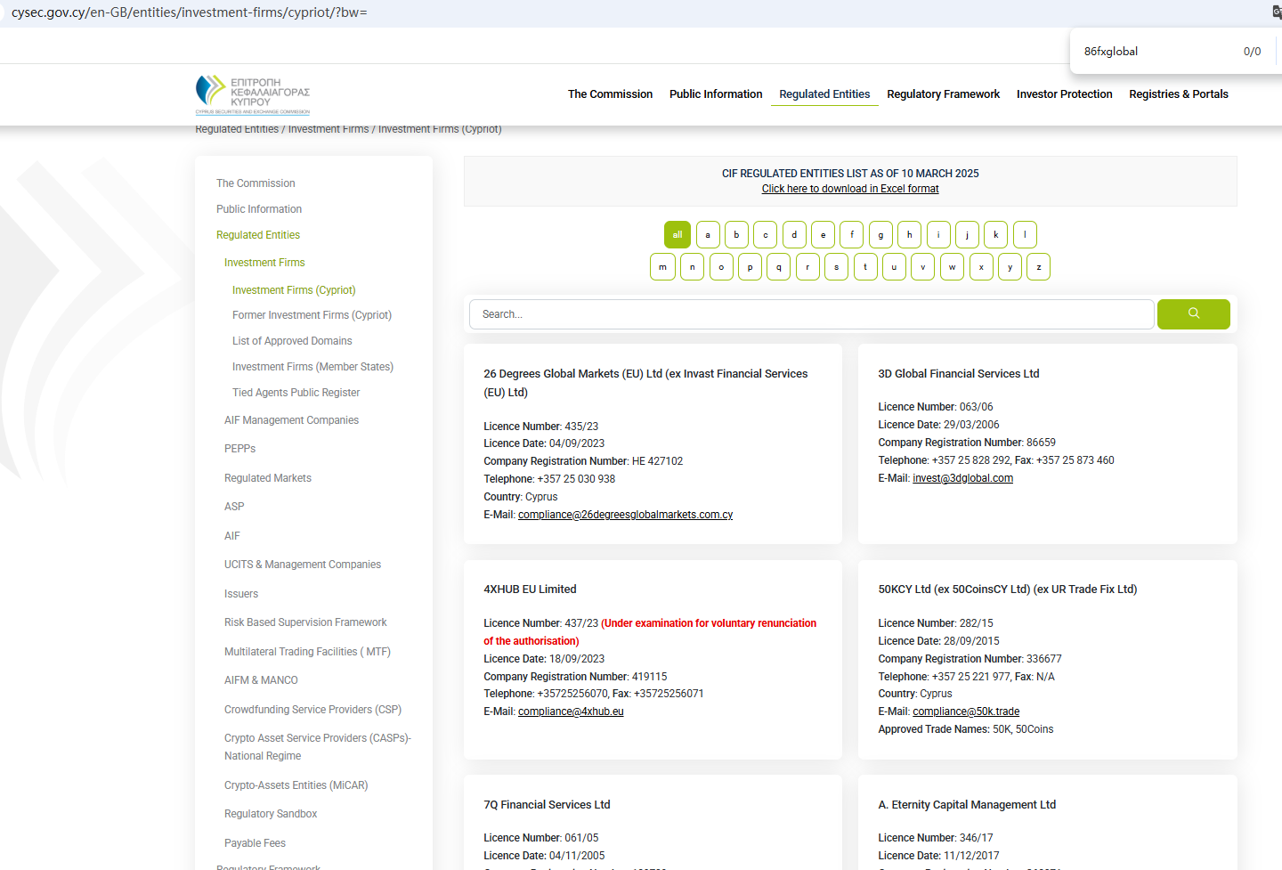 According to its website, it is regulated by both the Financial Conduct Authority (FCA) and the Cyprus Securities and Exchange Commission (CySEC). However, a search revealed no matching information with CySEC. Furthermore, the FCA issued a warning regarding 86fxglobal, suspecting that this company may be offering financial services or products without the necessary authorization.