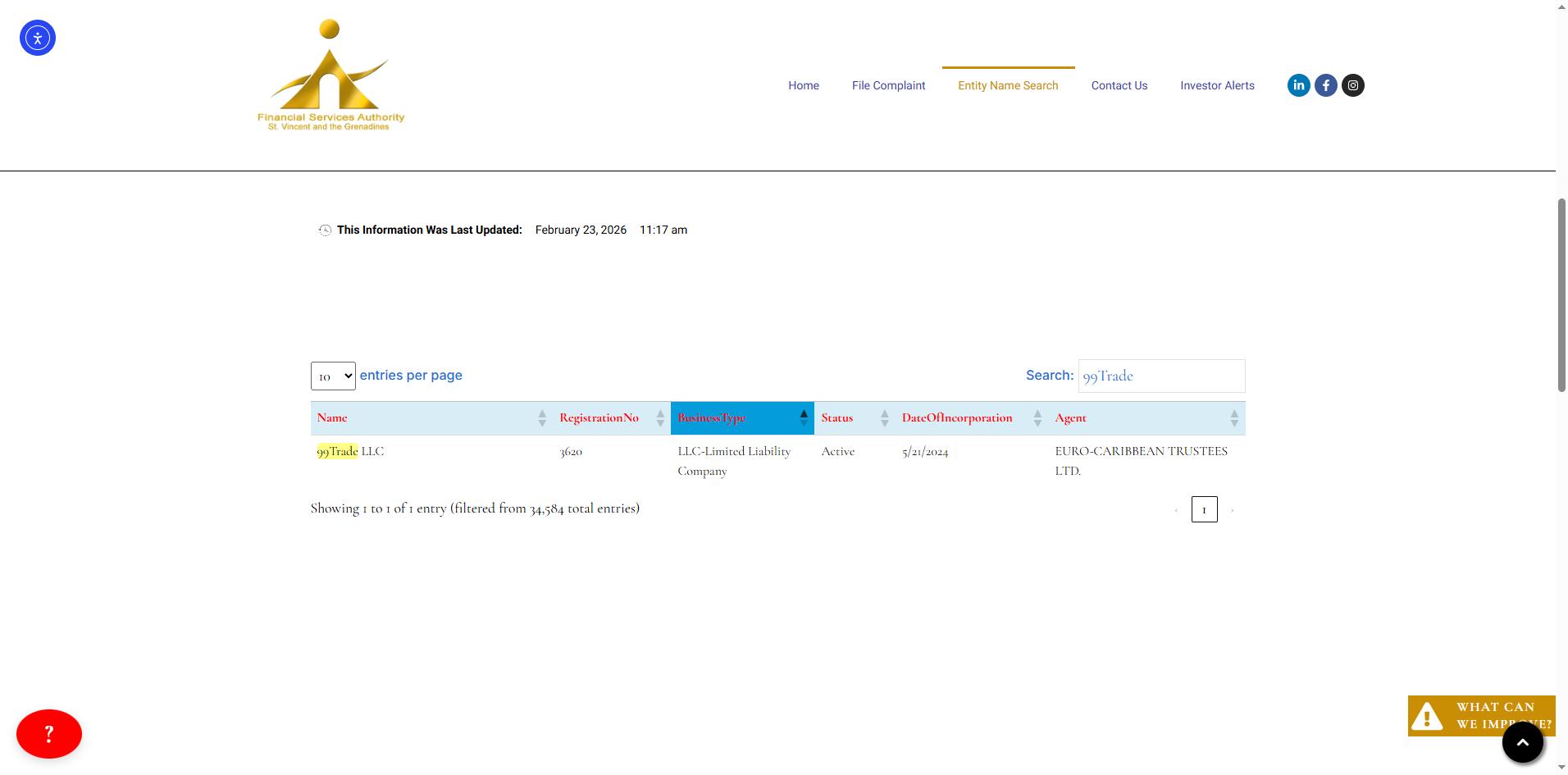 The only registration we could verify for this entity is with the Financial Services Authority (FSA) of Saint Vincent and the Grenadines. However, this registration merely grants the company International Business Company (IBC) status, which does not equate to a financial license, as the SVG FSA has publicly stated that it neither regulates nor licenses forex trading activities.