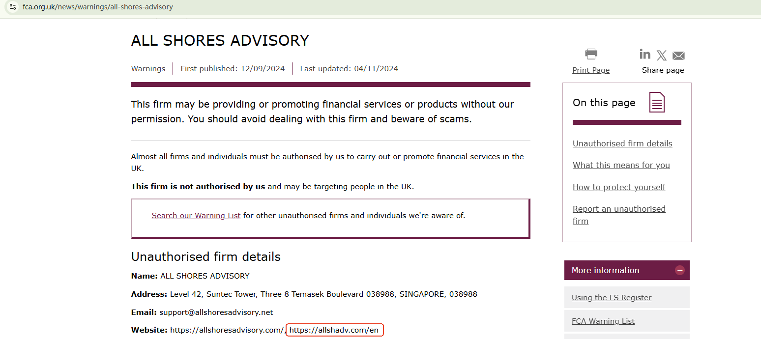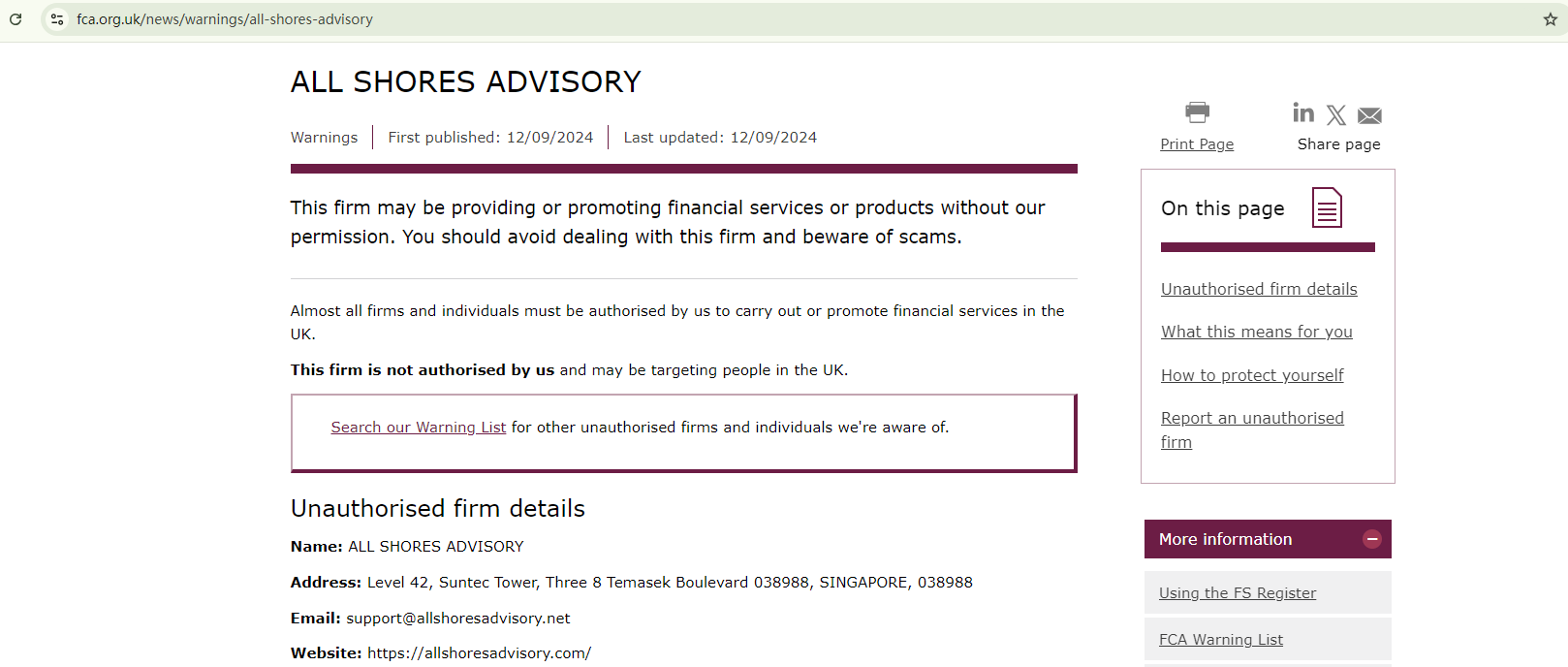 On September 12, 2024, the Financial Conduct Authority (FCA) issued a warning against ALL SHORES ADVISORY, believing this company might be providing financial services or products without proper authorization in the UK. https://www.fca.org.uk/news/warnings/all-shores-advisory