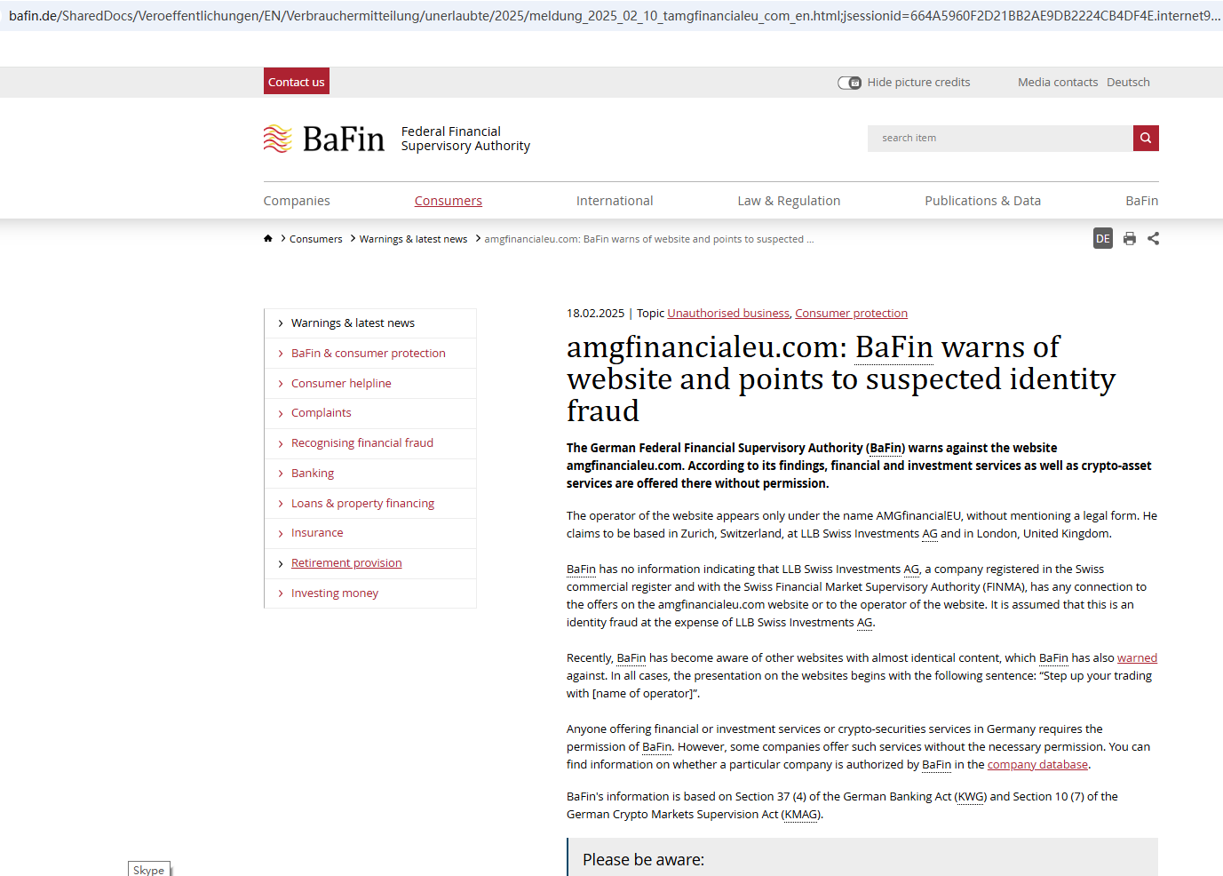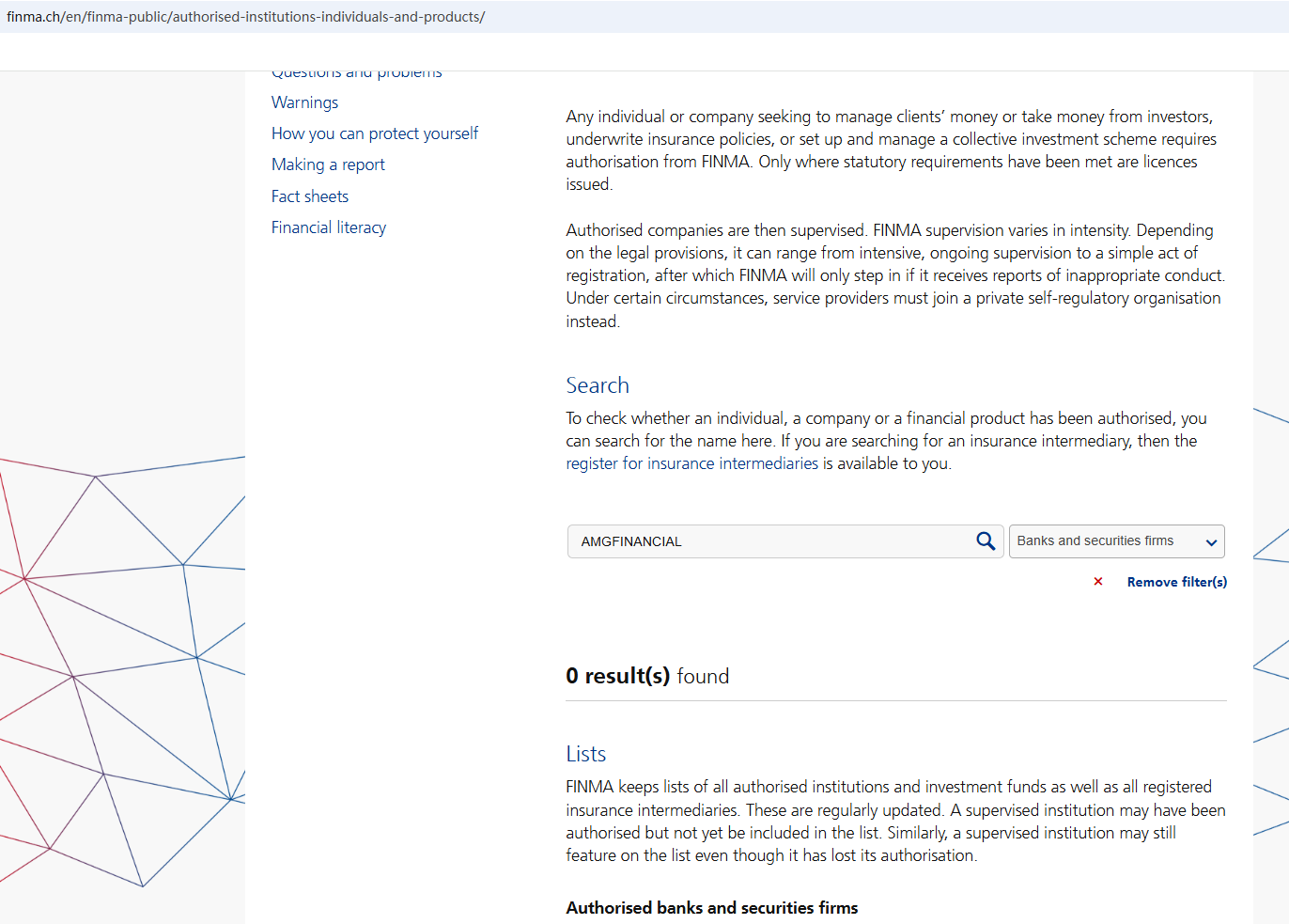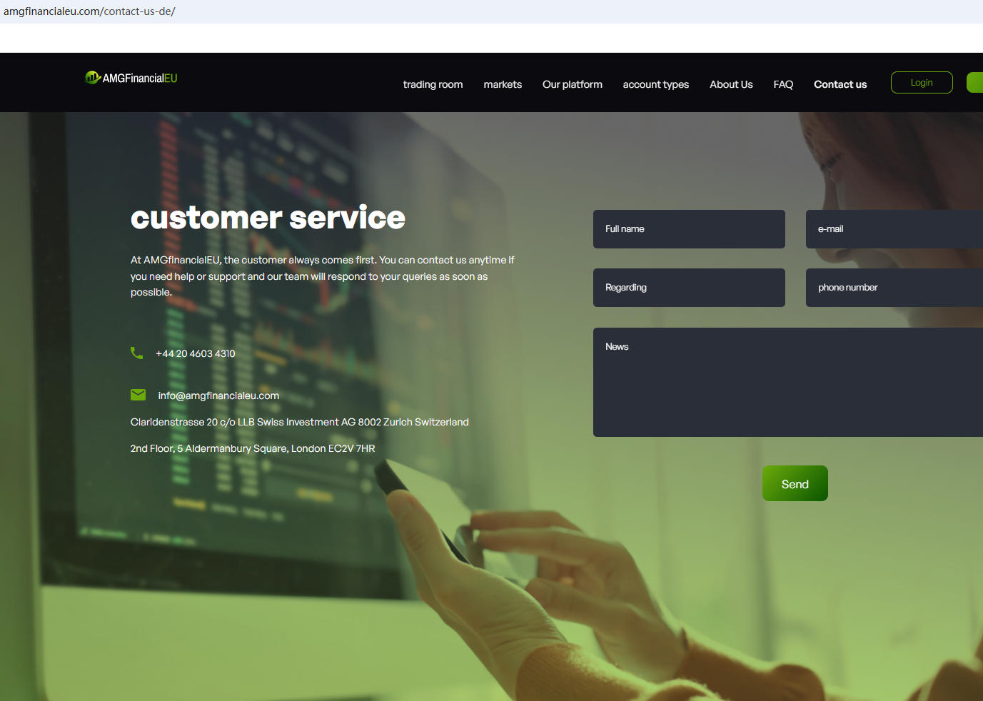 It claims to be a reliable broker but does not display any valid regulatory information on its website. It displays two addresses in Switzerland and London respectively. After searching, no matching information was found in Swiss Financial Market Supervisory Authority (FINMA) and Financial Conduct Authority (FCA). And the Federal Financial Supervisory Authority (BaFin) issued a warning against AMGfinancialEU for the lack of the required authorization.