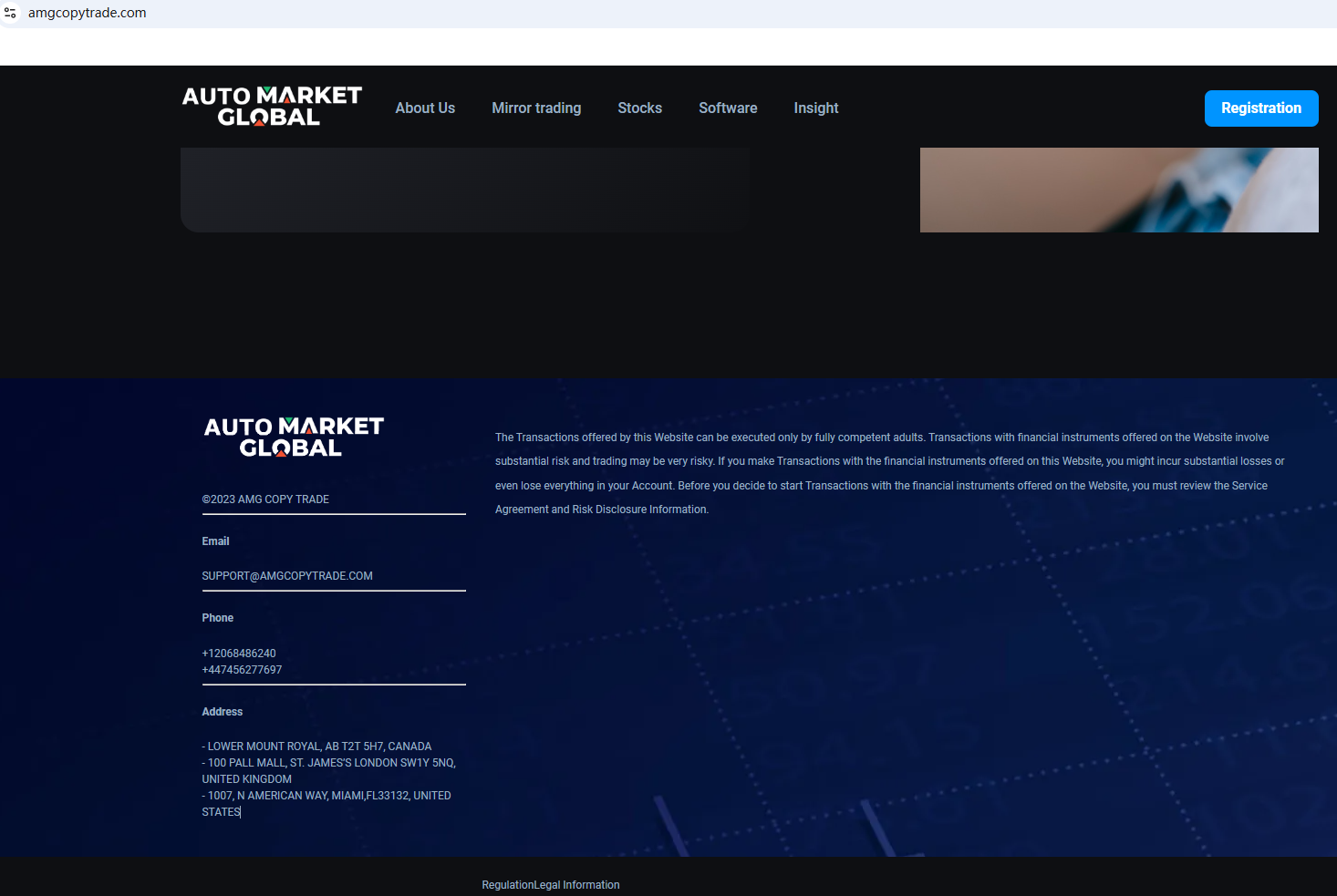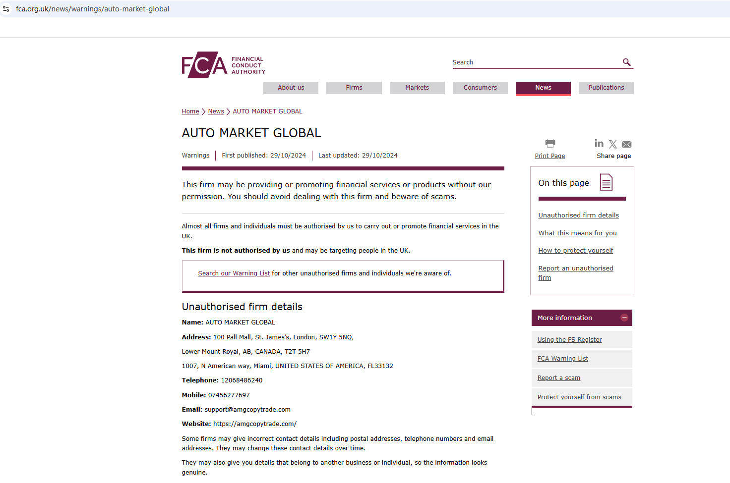 According to its website, it has offices in the United States, the United Kingdom, and Canada. Upon investigation, no matching information was found in the National Futures Association (NFA) and Investment Industry Regulatory Organization of Canada (IIROC). In addition, we found that the United Kingdom Financial Conduct Authority (FCA) issued a warning against AUTO MARKET GLOBAL, believing this company might be providing financial services or products without authorisation in the UK.In essence, AUTO MARKET GLOBAL is not regulated by any governing body. Entrusting it with investors' funds is highly risky, as there are no legal protections in place to safeguard the funds.AUTO MARKET GLOBAL appears to be a scam.