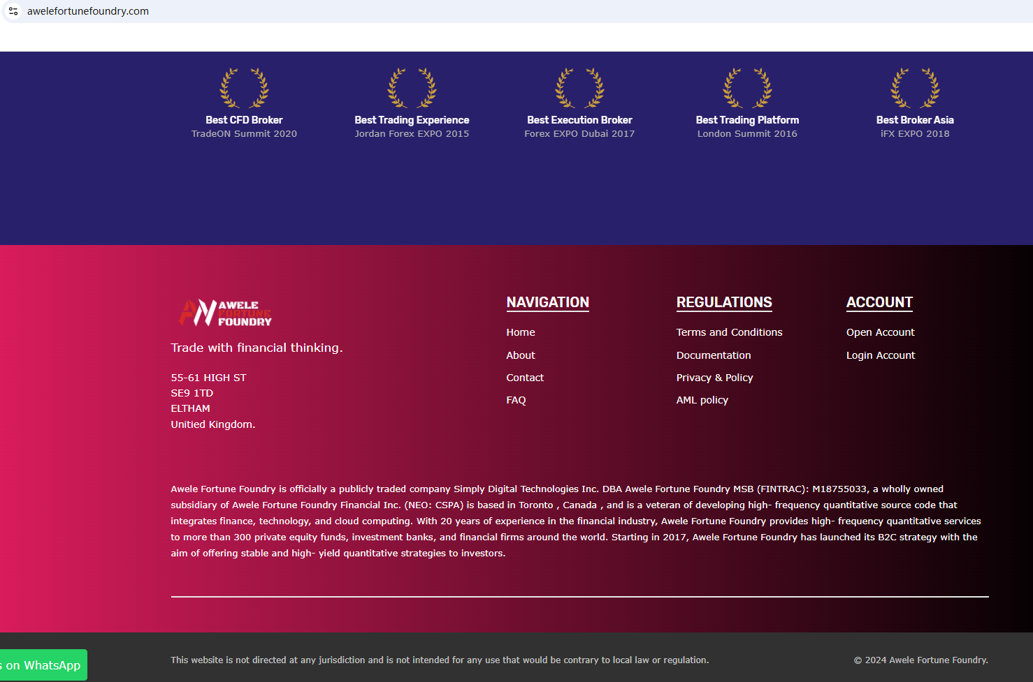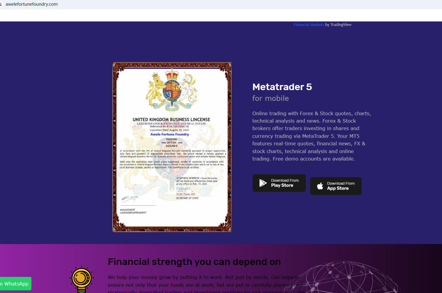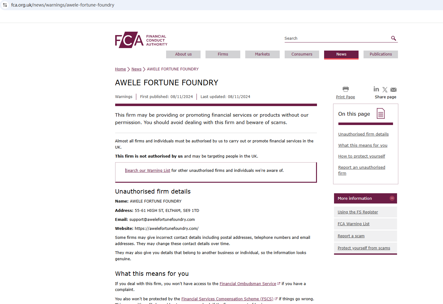 The template used by this website is a common template for fraudulent websites and has been marked by Brokersview many times before. In addition, it displays a registration certificate of Companies House (CH) on its website. In order to exercise foreign exchange rights in the UK, it is necessary to obtain the approval of the Financial Conduct Authority (FCA). Then, ridiculously, we found that the the Financial Conduct Authority (FCA) issued a warning against AWELE FORTUNE FOUNDRY, believing this company might be providing financial services or products without proper authorization in the UK.In essence, AWELE FORTUNE FOUNDRY is not regulated by any governing body. Entrusting it with investors' funds is highly risky, as there are no legal protections in place to safeguard the funds.AWELE FORTUNE FOUNDRY appears to be a scam.
