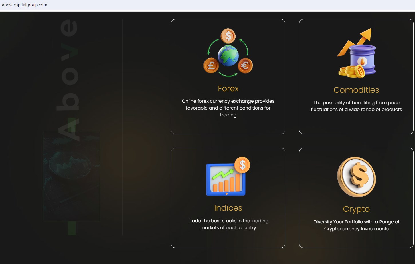 Above Capital claims to be a trusted Broker located inIsland of Moheli, Comoros Union and Dubai UAE, regulated by the MWALI INTERNATIONAL SERVICES AUTHORITY, offering wide range of financial services to traders, including Forex, Comodities, Indices, Crypto and more instruments in global markets.