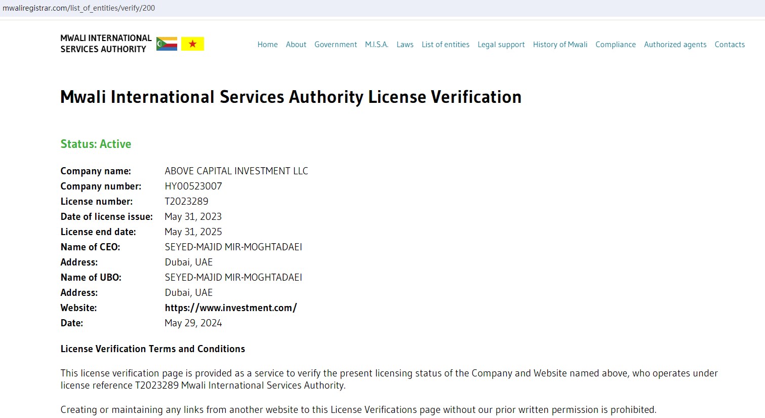 Above Capital claims to be a trusted Broker located inIsland of Moheli, Comoros Union and Dubai UAE, regulated by the MWALI INTERNATIONAL SERVICES AUTHORITY, offering wide range of financial services to traders, including Forex, Comodities, Indices, Crypto and more instruments in global markets.Upon investigation, we found that ABOVE CAPITAL INVESTMENT LLC is a brokerage company licensed with the MISA, but the operating URL is www.investment.com. Obviously abovecapitalgroup.com is a clone company and is not regulated or licensed by the MISA.The truth is that Above Capital (abovecapitalgroup.com) is not regulated by any regulators. Letting it hold or control investors'money is unsafe, and the money can not be protected by any laws.Above Capital is a scam.