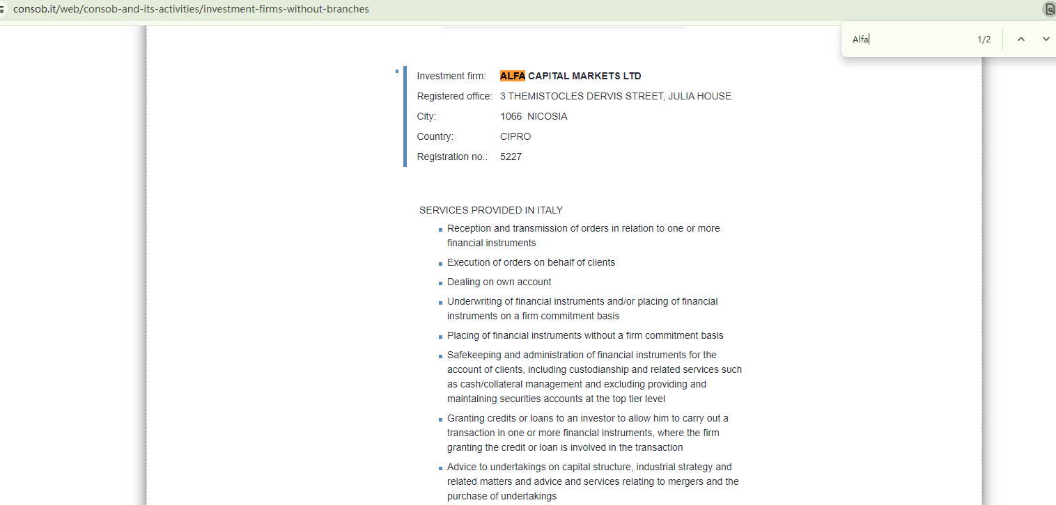 AlfaCapitalMarket merely asserts that it is regulated by the Cyprus Securities and Exchange Commission (CySEC) and the Italian Companies and Exchange Commission (CONSOB), but fails to provide any specific details about its regulatory status.We attempted to use "Alfa" as the keyword to search for corresponding records in the registers of the CySEC and the CONSOB. Although there is a company named Alfa Capital Markets Ltd, the contact information and approved domains published by the financial regulators suggest that this legitimate entity does not appear to have any relationship with AlfaCapitalMarket. The warning issued by the CySEC against AlfaCapitalMarket further underscores AlfaCapitalMarket's fraudulent nature.In essence, AlfaCapitalMarket is not regulated by any governing body. Entrusting it with investors' funds is highly risky, as there are no legal protections in place to safeguard the funds.AlfaCapitalMarket appears to be a scam.