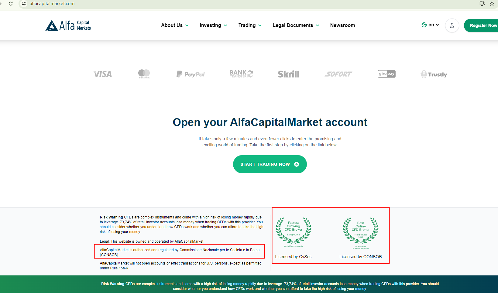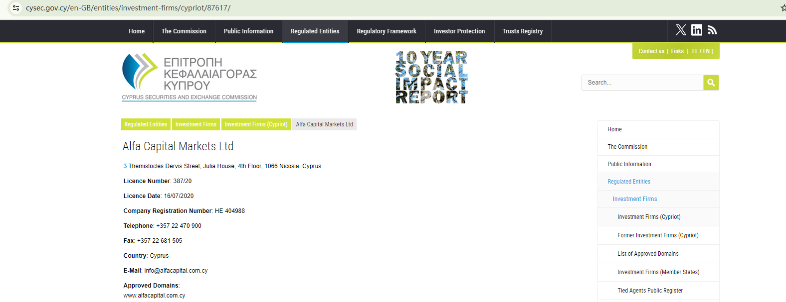 AlfaCapitalMarket merely asserts that it is regulated by the Cyprus Securities and Exchange Commission (CySEC) and the Italian Companies and Exchange Commission (CONSOB), but fails to provide any specific details about its regulatory status.