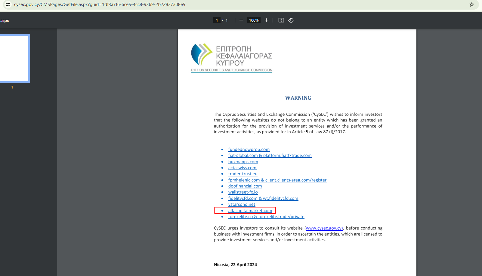 We attempted to use "Alfa" as the keyword to search for corresponding records in the registers of the CySEC and the CONSOB. Although there is a company named Alfa Capital Markets Ltd, the contact information and approved domains published by the financial regulators suggest that this legitimate entity does not appear to have any relationship with AlfaCapitalMarket. The warning issued by the CySEC against AlfaCapitalMarket further underscores AlfaCapitalMarket's fraudulent nature.