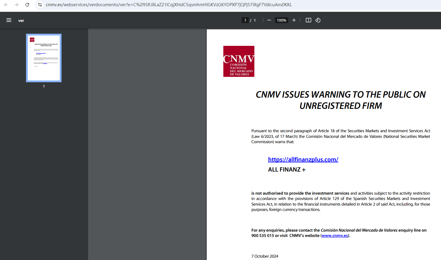 The Comisión Nacional del Mercado de Valores (CNMV) added ALL FINANZ + to its warning list for providing investment services without authorization.