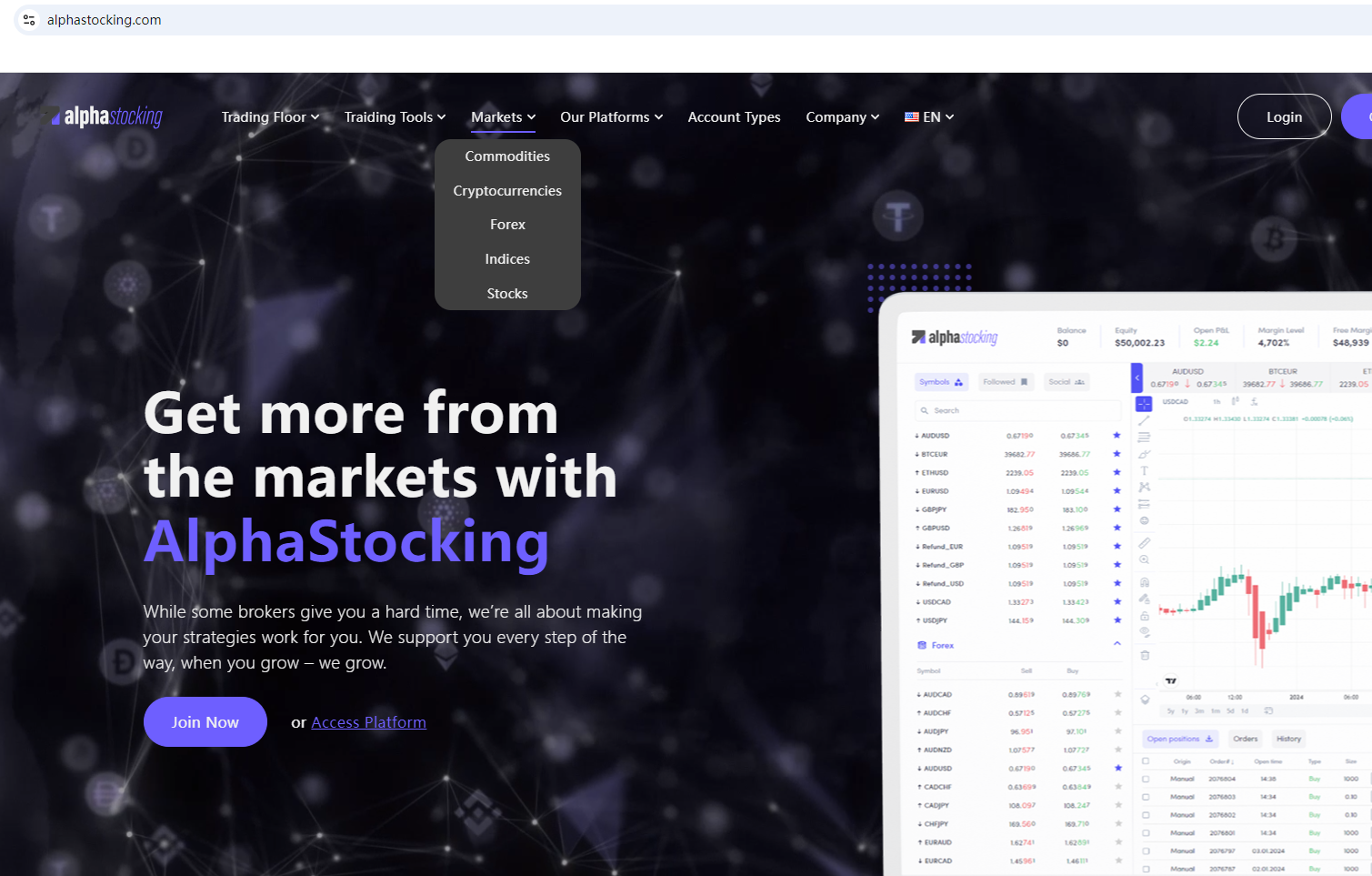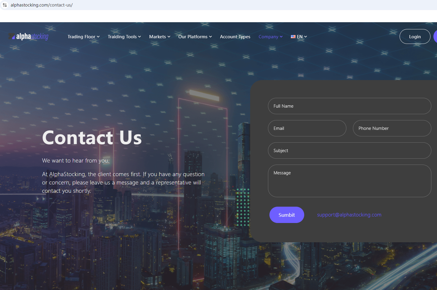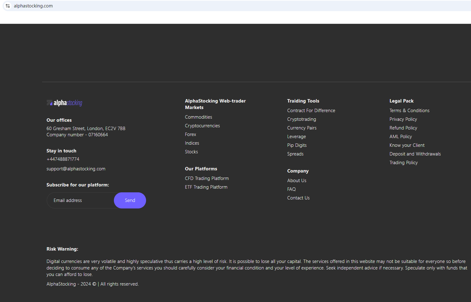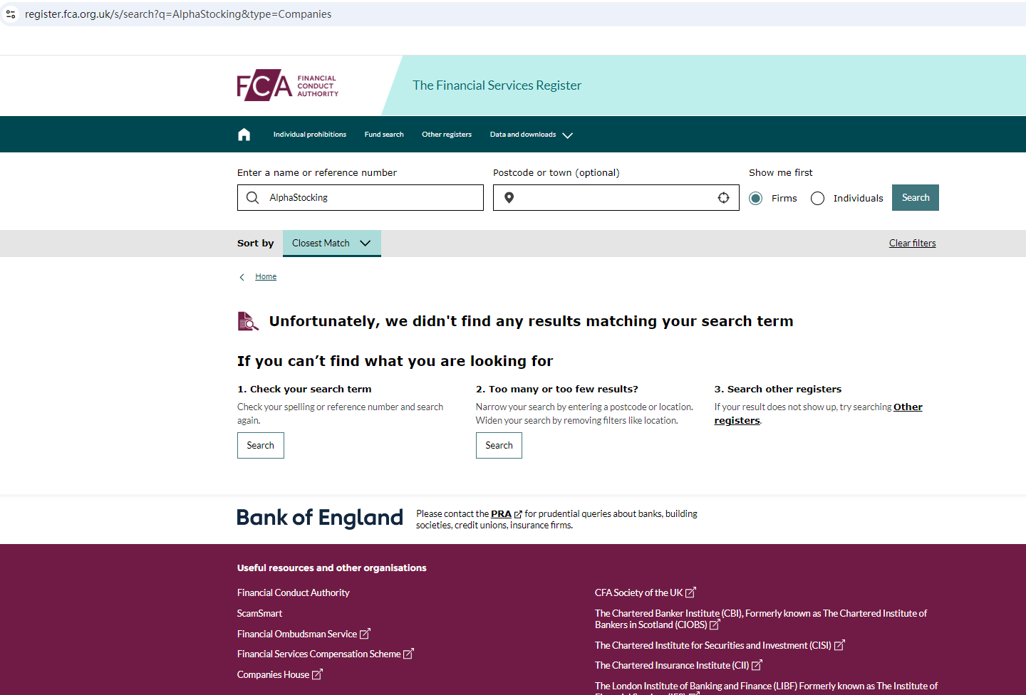 According to its website, it is located in the UK. Upon investigation, no matching information was found in the Financial Conduct Authority (FCA). In addition, the Federal Financial Supervisory Authority (BaFin) warned consumers about the services offered by the company AlphaStocking (alphastocking.com), which is offering financial and investment services without the required authorization.Therefore, entrusting AlphaStocking with your funds is risky due to its unregulated status.