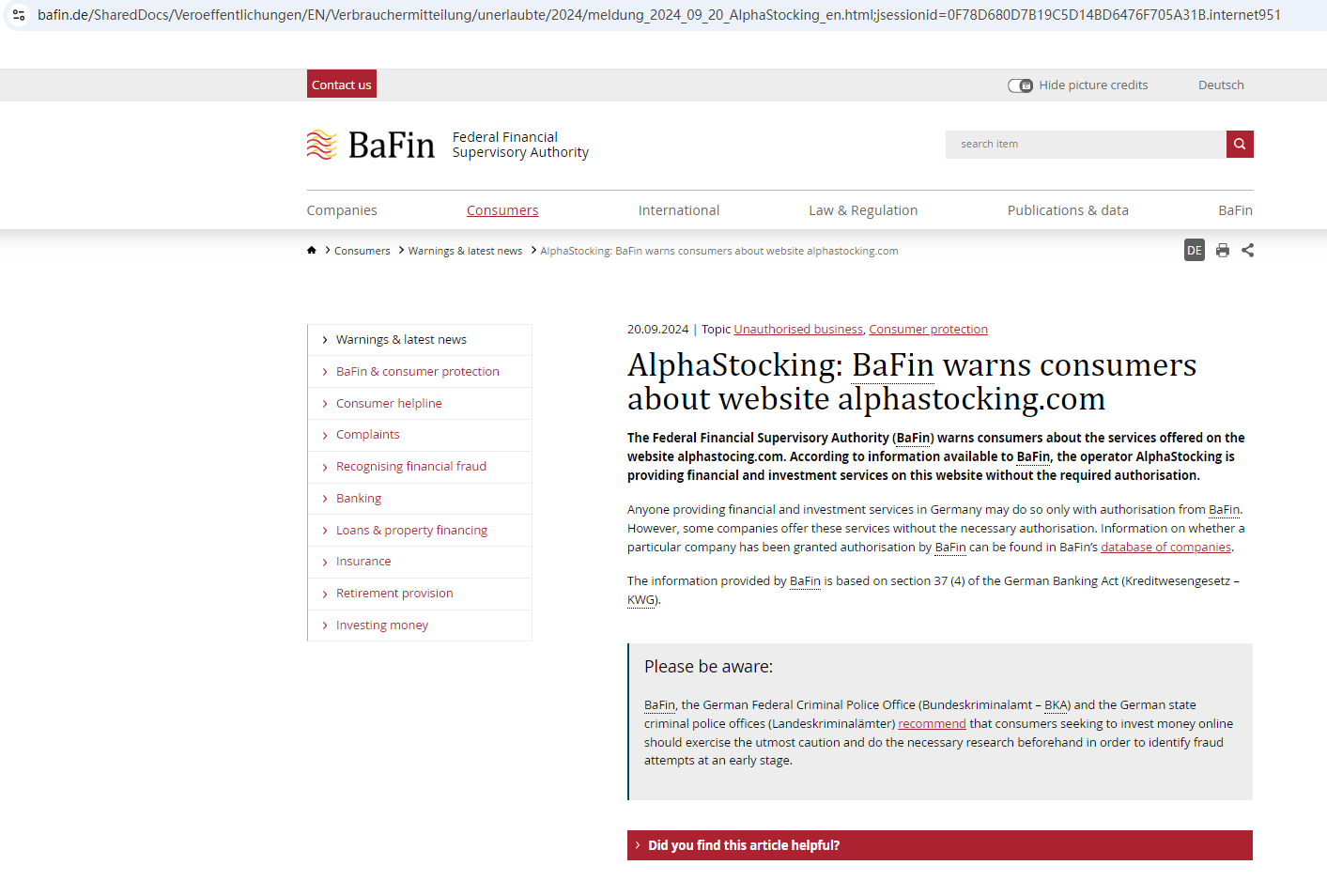 In addition, the Federal Financial Supervisory Authority (BaFin) warned consumers about the services offered by the company AlphaStocking (alphastocking.com), which is offering financial and investment services without the required authorization.