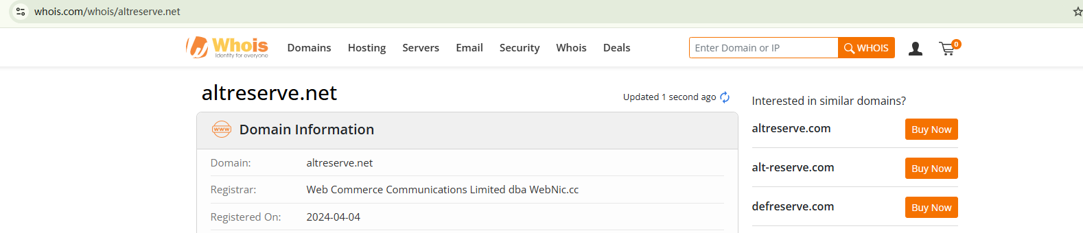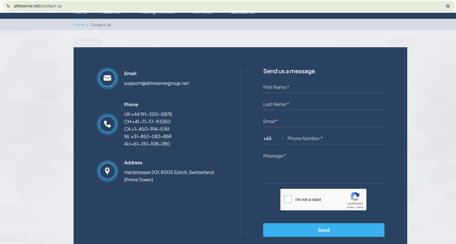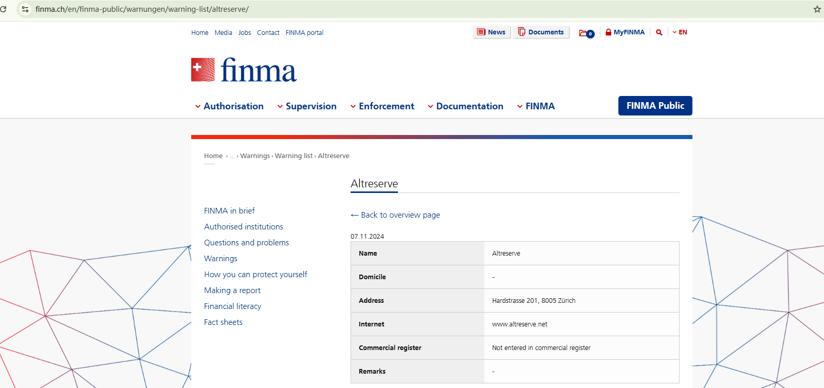 The domain name of Altreserve was registered recently in April 2024, making its website relatively new. While Altreserve lists phone numbers for different countries on their contact page, it doesn't provide any valid licensing information to substantiate its legitimacy within these jurisdictions. Additionally, the Swiss Financial Market Supervisory Authority (FINMA) has issued a warning against Altreserve, stating that this broker is not entered in its commercial register.
