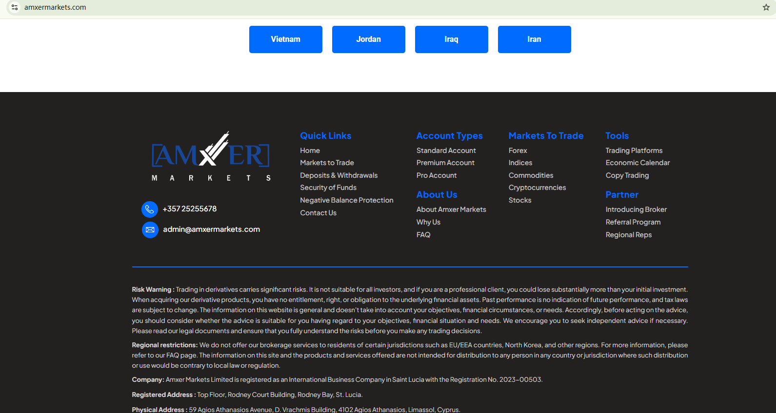 Amxer Markets claims to be an ECN/STP Forex broker registered in St. Lucia. However, a company registration alone does not equate to a financial regulator's license. Moreover, St. Lucia does not license forex trading activities. Being an offshore jurisdiction, St. Lucia offers minimal protection for investors. Without any other valid licenses to prove that Amxer Markets is under proper supervision, there is no assurance of the broker's compliance.In essence, Amxer Markets is not regulated by any governing body. Entrusting it with investors' funds is highly risky, as there are no legal protections in place to safeguard the funds.Amxer Markets appears to be a scam.