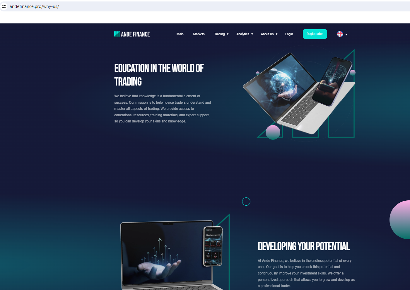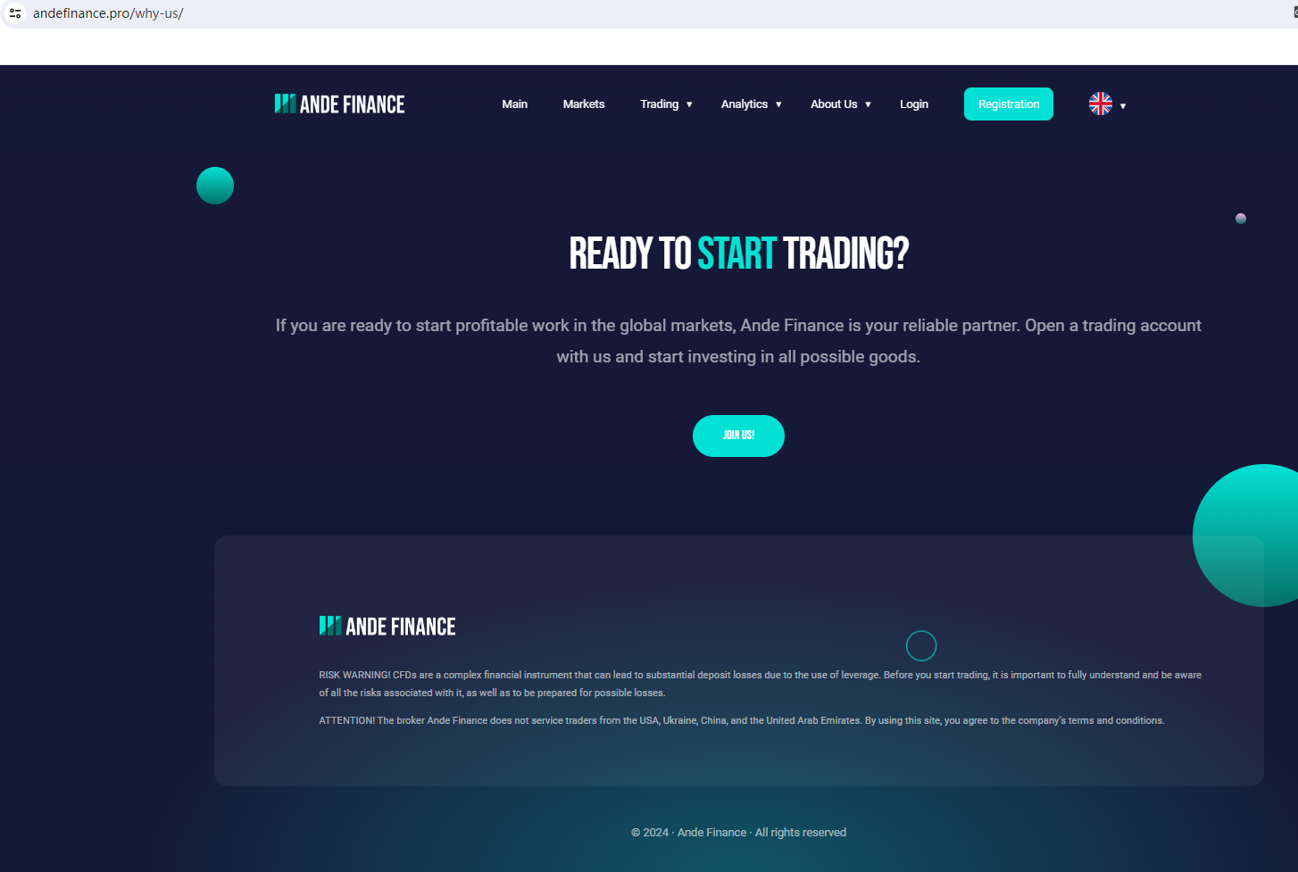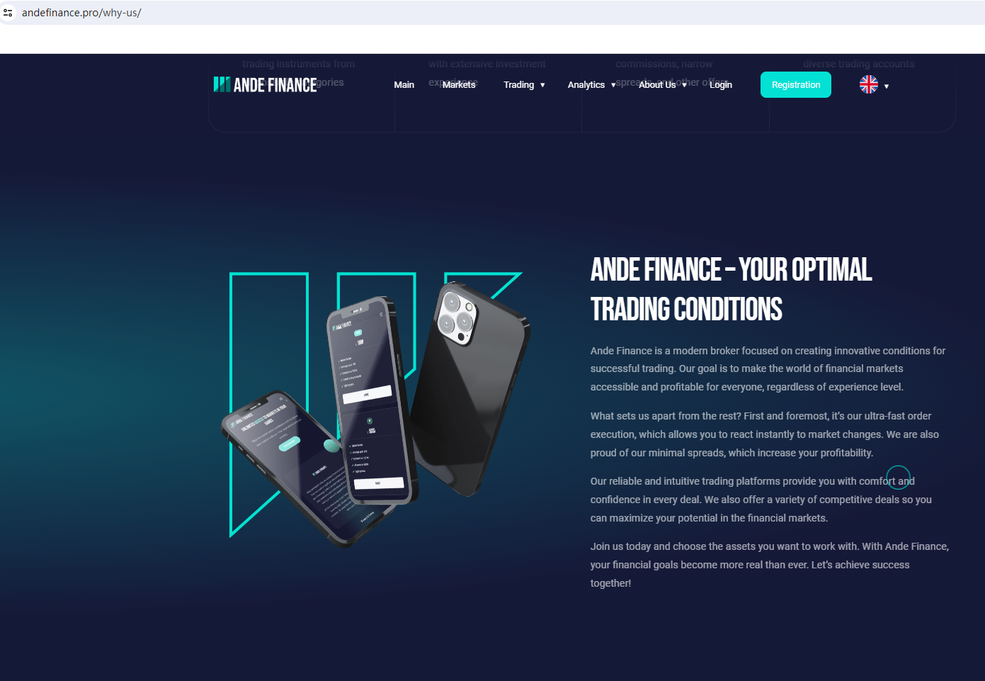 Ande Finance claims to be a reliable company without presenting any information about its regulation or contact. The lack of such important information may be a distinct signal of an unlicensed broker, as regulated companies always present their accreditations and licenses in a prominent position. It is a red flag.