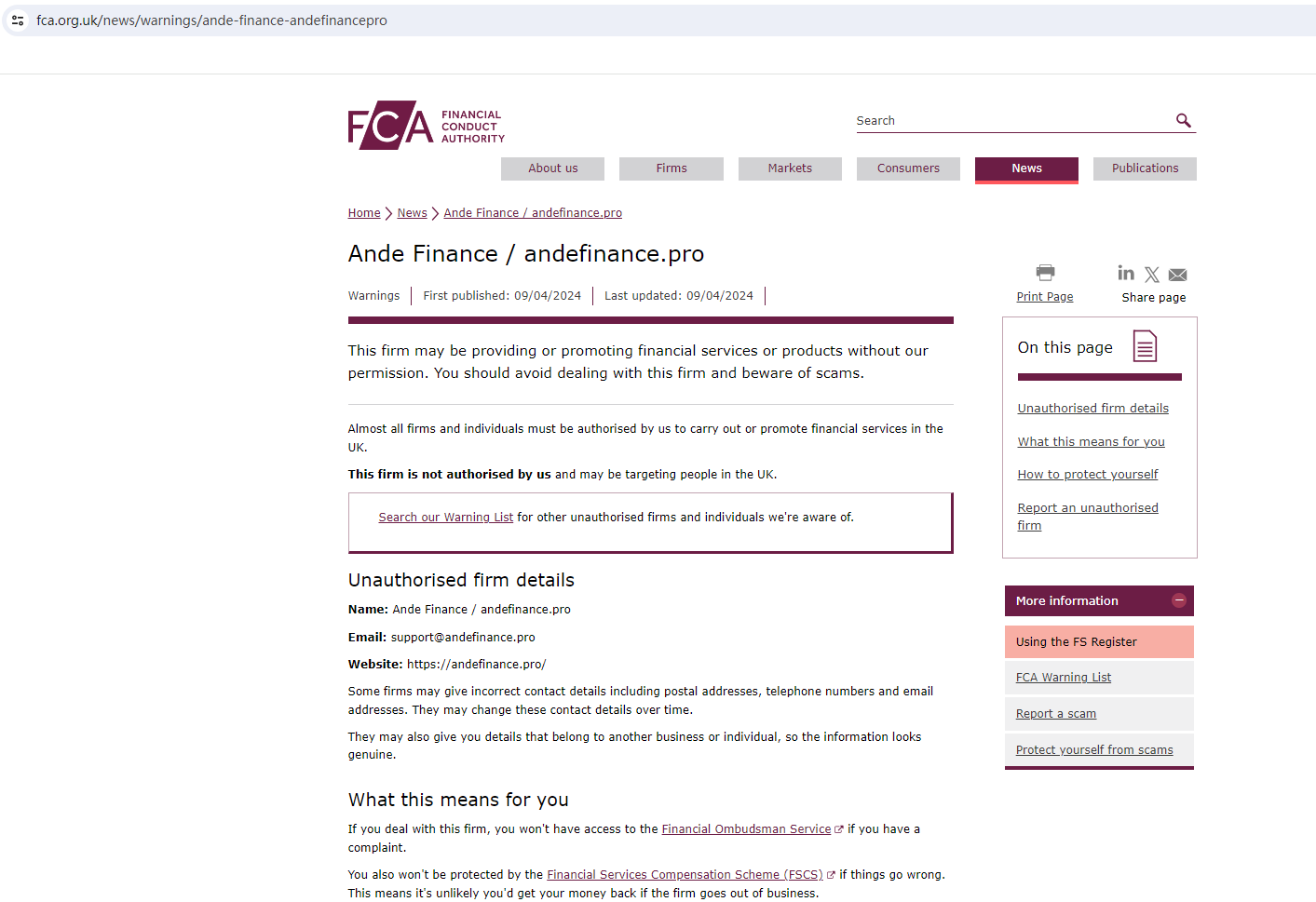 The Financial Conduct Authority (FCA) issued a warning against Ande Finance, believing this company might be providing financial services or products without proper authorization in the UK.