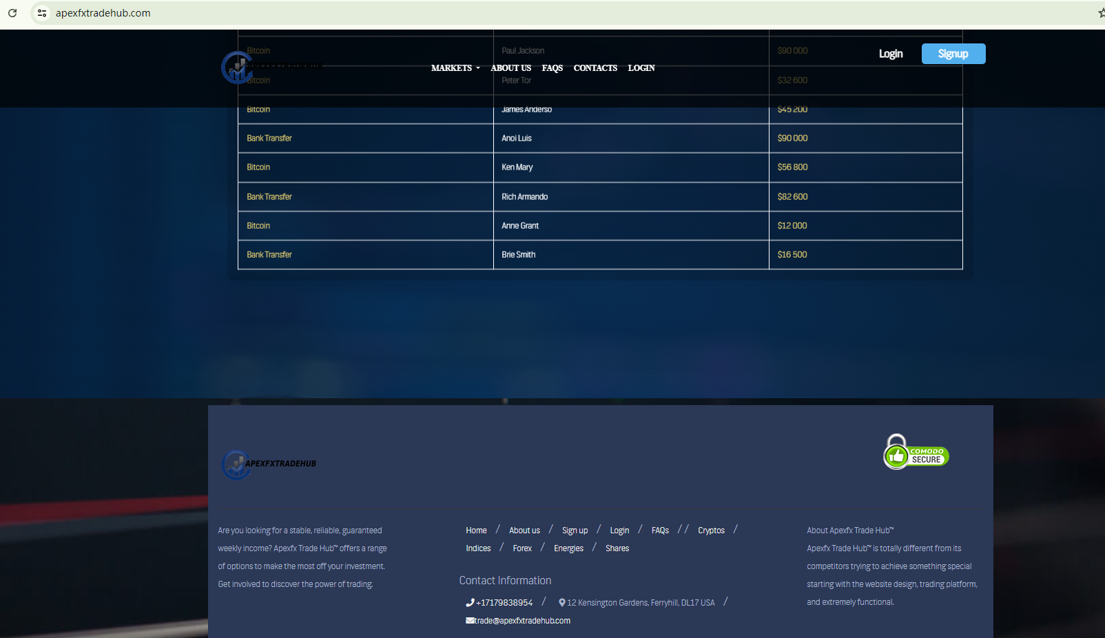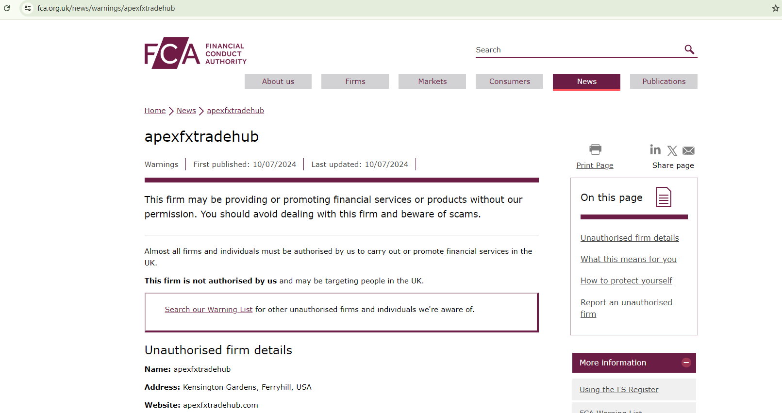 Apexfxtradehub's website looks identical to some dubious forex websites previously flagged by BrokersView, both in content and graphic. Likewise, the broker doesn't provide any valid licensing information to support its legitimacy.In addition, the Financial Conduct Authority (FCA) has issued a warning against Apexfxtradehub, believing this company might be providing financial services or products without proper authorization in the UK.In essence, Apexfxtradehub is not regulated by any governing body. Entrusting it with investors' funds is highly risky, as there are no legal protections in place to safeguard the funds.Apexfxtradehub appears to be a scam.