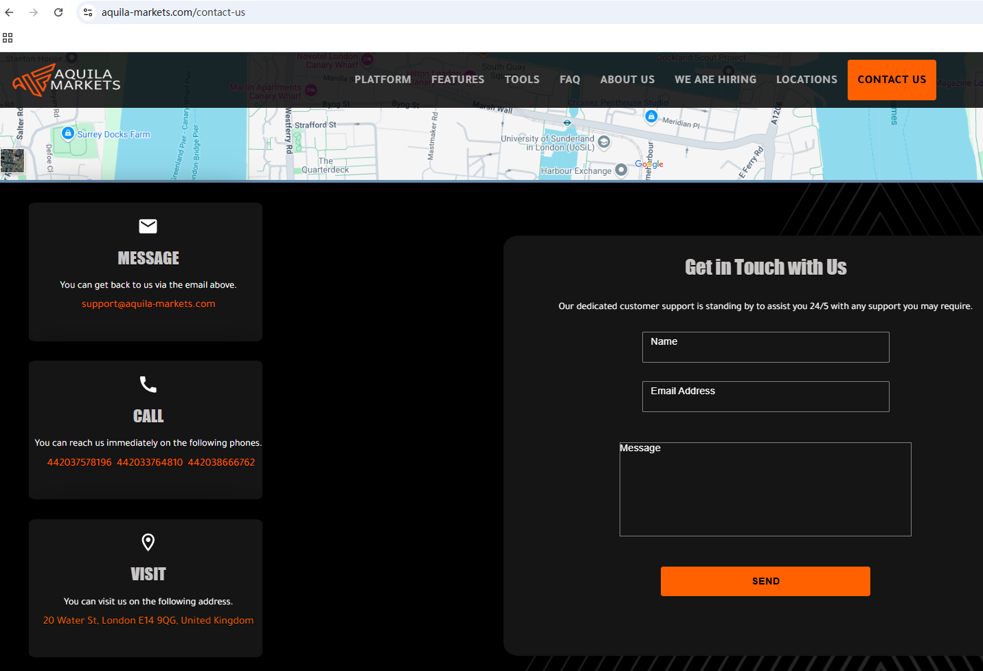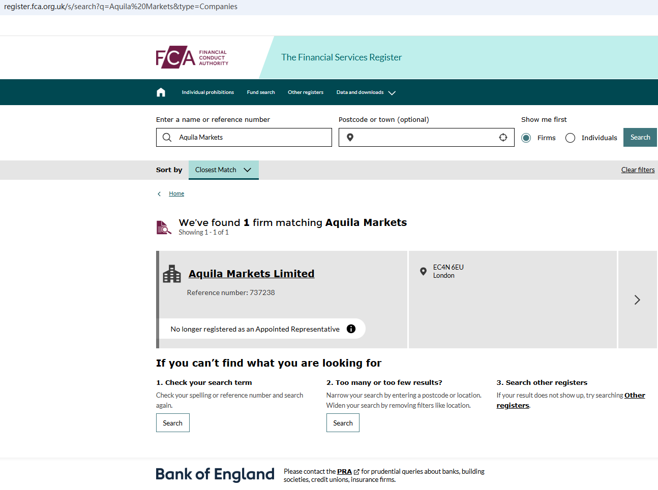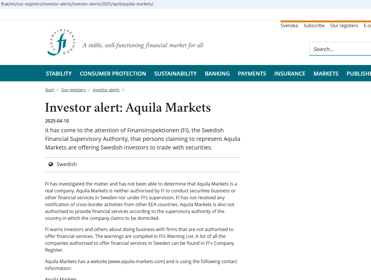 According to its website, it is located in the UK. Upon investigation, we found that it is no longer regulated by the Financial Conduct Authority (FCA). What's more, the Finansinspektionen (FI) issued a warning against Aquila Markets, suspecting that it is not a real company.