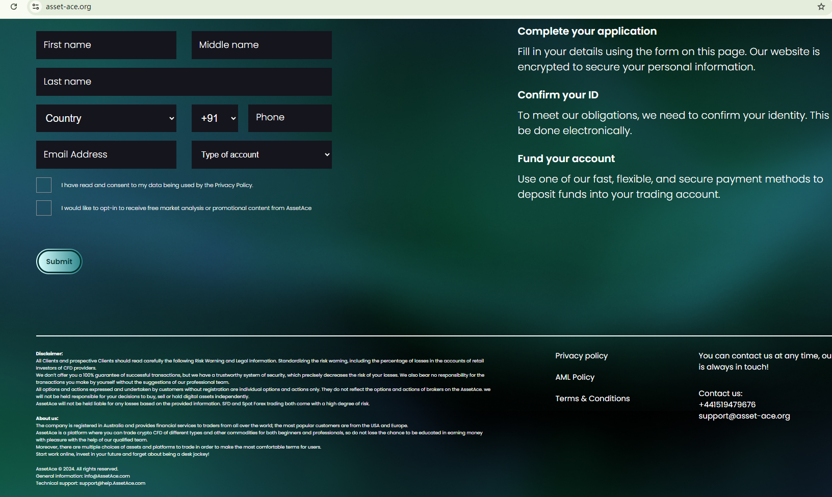 AssetAce doesn't provide regulatory information for verification. This lack of licensing details is a warning sign, as legitimate brokers always present it in the website footer.