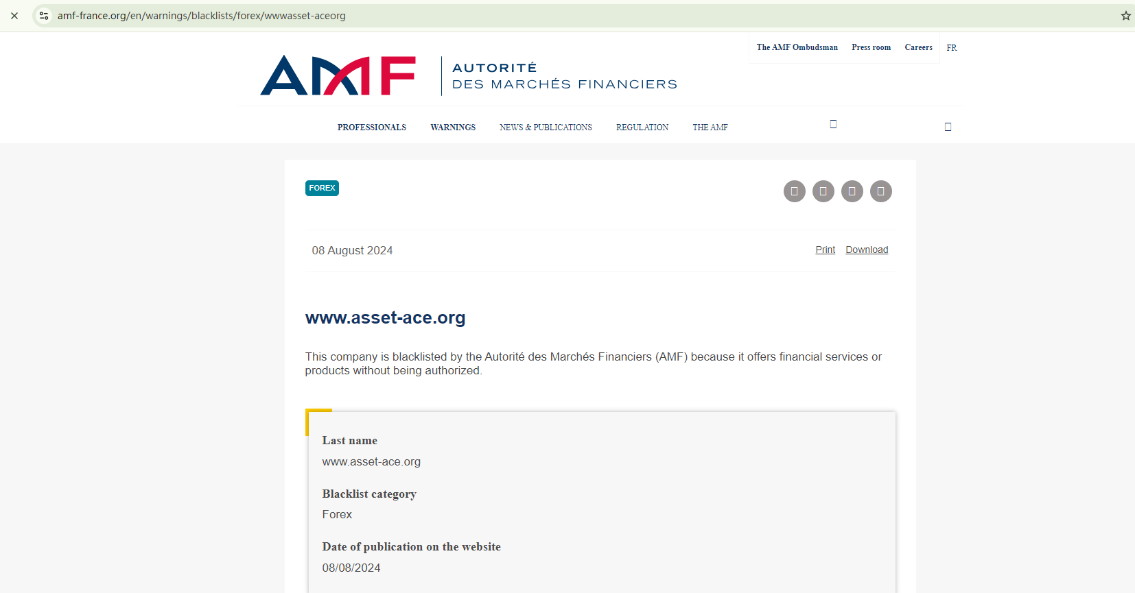In addition, the Financial Authority (Autorité des Marchés Financiers, AMF) has blacklisted AssetAce for offering financial services or products without being authorized.
