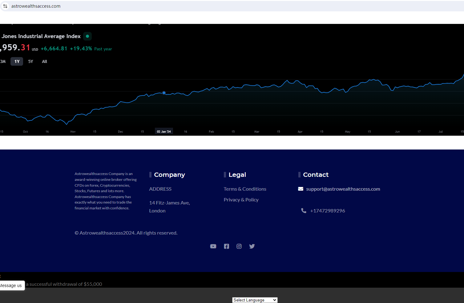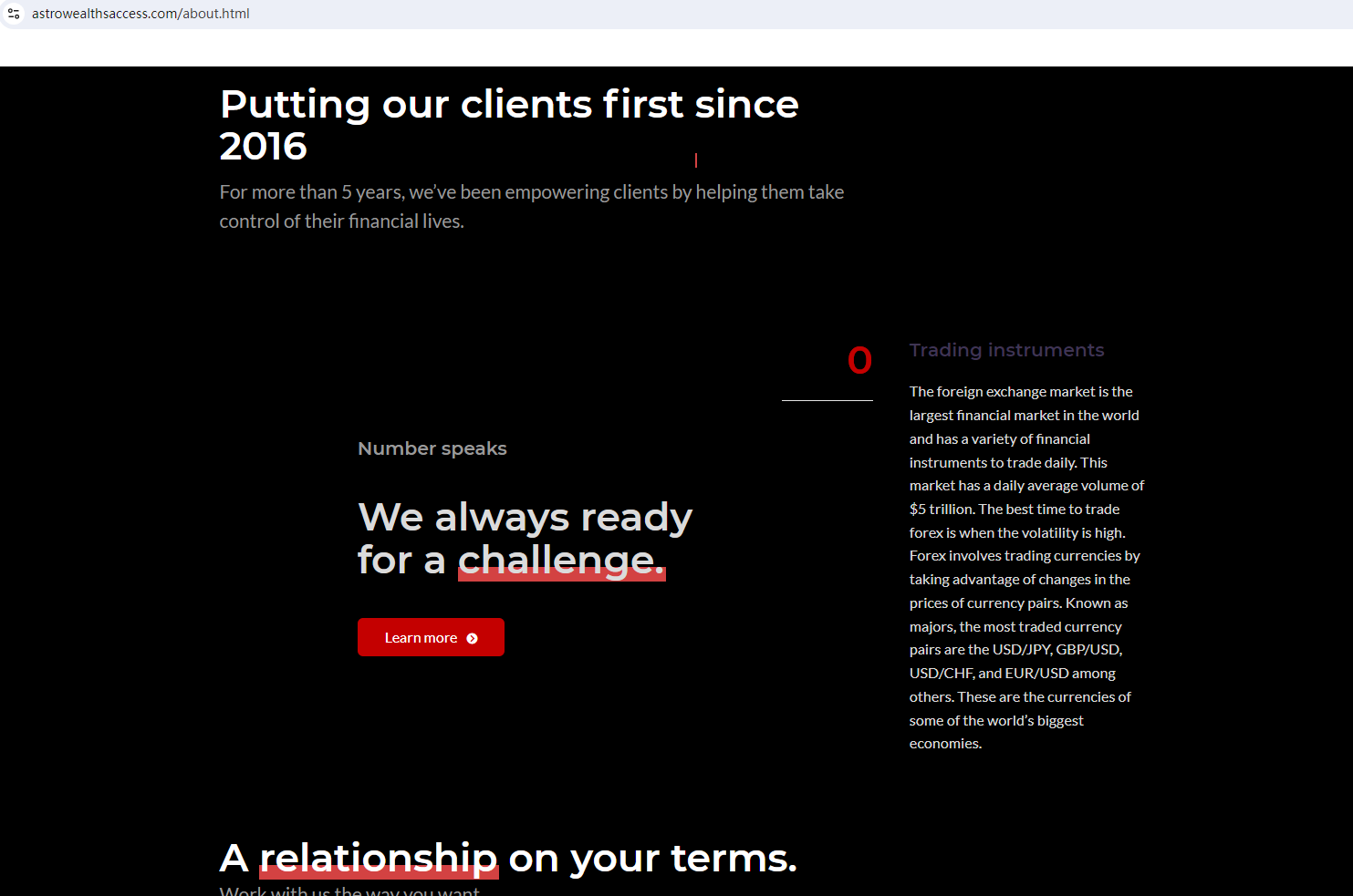 According to its website, it is registered in the UK, and no other regulatory information is displayed for inquiry. It is worth noting that the website template is a common template for fraudulent websites and has been marked by Brokersview many times before. Investors are advised to stay away from it.In addition, the Financial Conduct Authority (FCA) issued a warning against Astrowealthsaccess, believing this company might be providing financial services or products without proper authorization in the UK.The truth is that Astrowealthsaccess is not regulated by any regulators. Letting it hold or control investors' money is unsafe, and the money can not be protected by any laws.Astrowealthsaccess is a scam.