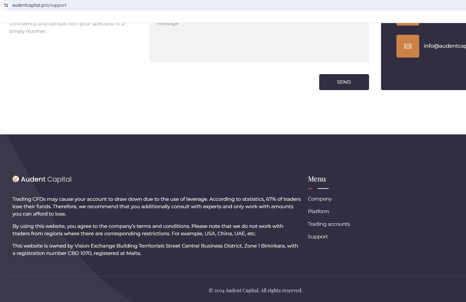 According to its website, it claims regulated by Malta Financial Services Authority (MFSA). Upon investigation, no matching information was found in the MFSA.In addition, the Comisión Nacional del Mercado de Valores (CNMV) issued a warning that Audent Capital (aka Audint Capital) was providing financial services or products without authorisation.The truth is that Audent Capital (aka Audint Capital) is not regulated by any regulators. Letting it hold or control investors' money is unsafe, and the money can not be protected by any laws.Audent Capital (aka Audint Capital) is a scam.