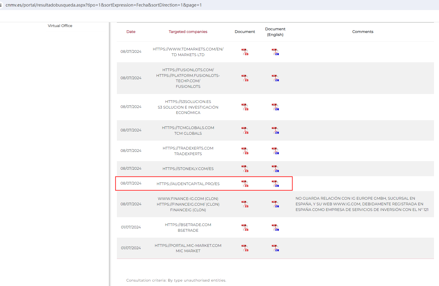 In addition, the Comisión Nacional del Mercado de Valores (CNMV) issued a warning that Audent Capital (aka Audint Capital) was providing financial services or products without authorisation.