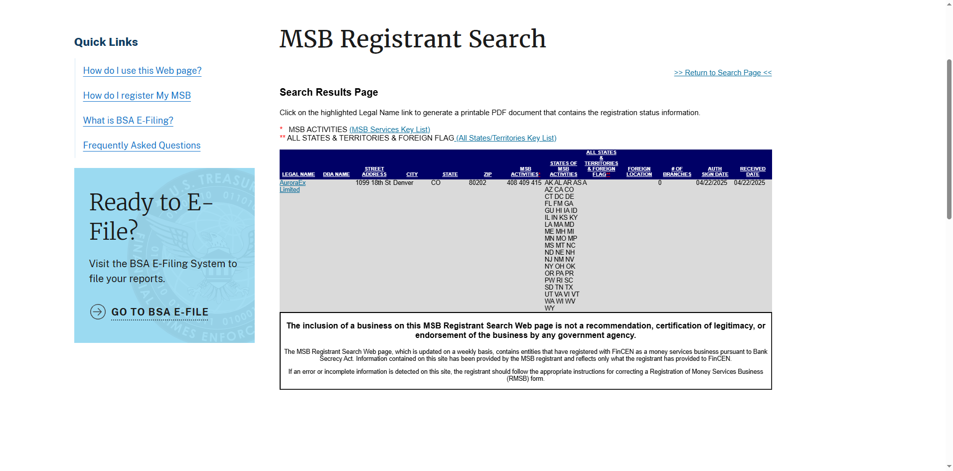 AuroraEx claims to be registered in the United States and holds a Money Services Business (MSB) registration with the number 31000298380732. While we have verified that this registration number is indeed assigned to AuroraEx Limited, it is crucial to understand that the issuing agency, the Financial Crimes Enforcement Network (FinCEN), does not regulate forex brokers or provide oversight for trading activities.