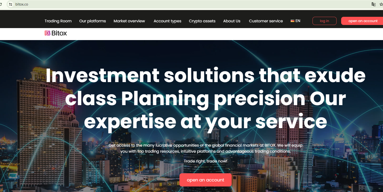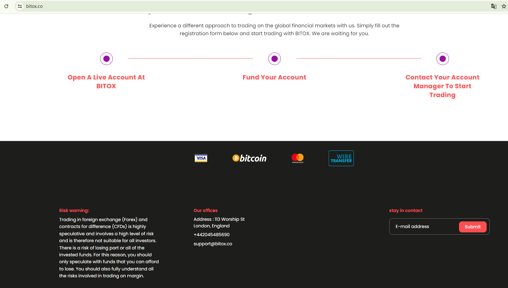 BITOX was red-flagged by the Federal Financial Supervisory Authority (BaFin) as a case of identity theft. According to BaFin, this website is identical to those on the BaFin's warning list. What's more, BITOX falsely claims to be associated with a legitimate company HF Markets (UK) Limited and to be subject to the BaFin's oversight. To clarify, BaFin issued the warning, refuting such claims and advising investors to stay way from BITOX.In essence, BITOX is not regulated by any governing body. Entrusting it with investors' funds is highly risky, as there are no legal protections in place to safeguard the funds.BITOX appears to be a scam.
