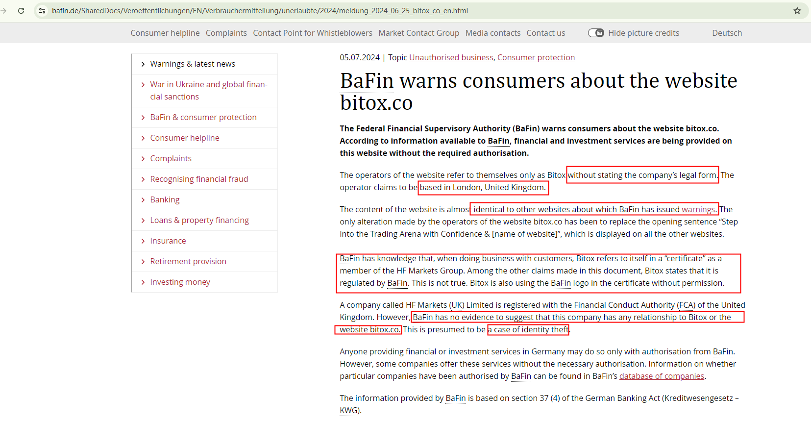 BITOX was red-flagged by the Federal Financial Supervisory Authority (BaFin) as a case of identity theft. According to BaFin, this website is identical to those on the BaFin's warning list. What's more, BITOX falsely claims to be associated with a legitimate company HF Markets (UK) Limited and to be subject to the BaFin's oversight. To clarify, BaFin issued the warning, refuting such claims and advising investors to stay way from BITOX.
