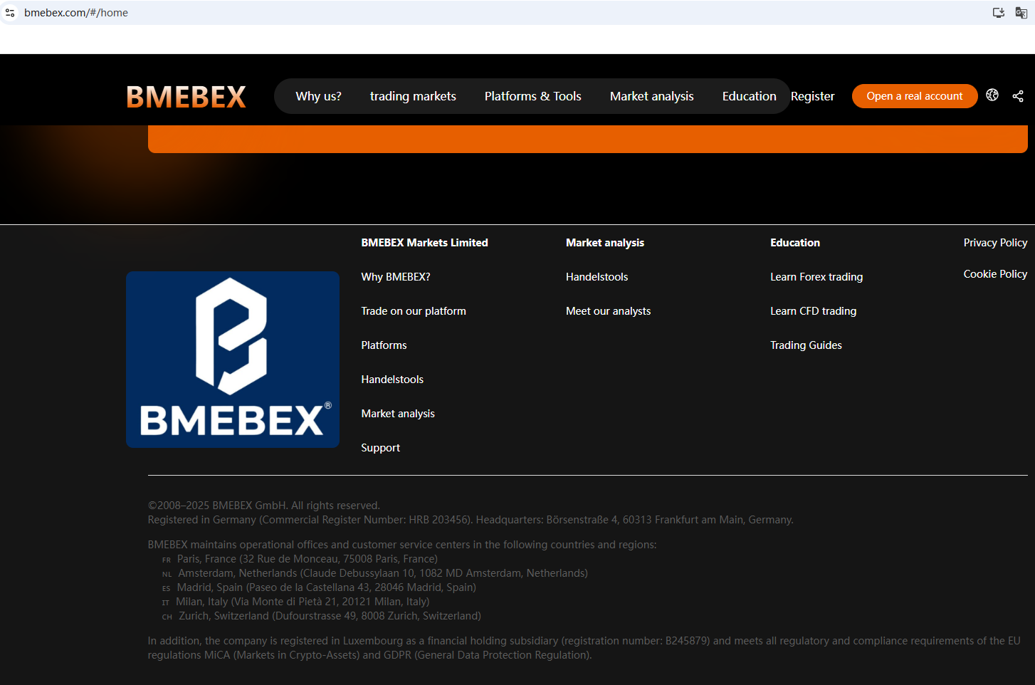 According to its website, it claims to be registered in Luxembourg, but after searching, no matching information was found in the Commission de Surveillance du Secteur Financier (CSSF). In addition, the National Securities Market Commission (CNMV) issued a warning against BMEBEX, believing this company might be providing financial services or products without proper authorization.
