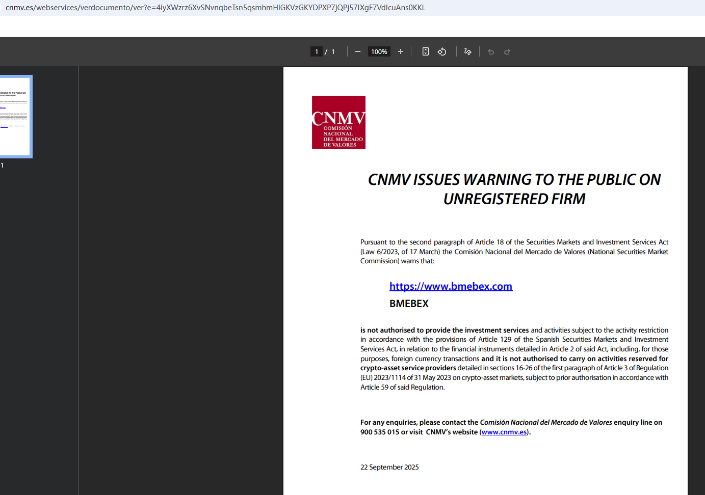 On Sept 22, 2025, the National Securities Market Commission (CNMV) issued a warning against BMEBEX, believing this company might be providing financial services or products without proper authorization. https://www.cnmv.es/webservices/verdocumento/ver?e=4iyXWzrz6XvSNvnqbeTsn5qsmhmHlGKVzGKYDPXP7jQPj57IXgF7VdIcuAns0KKL