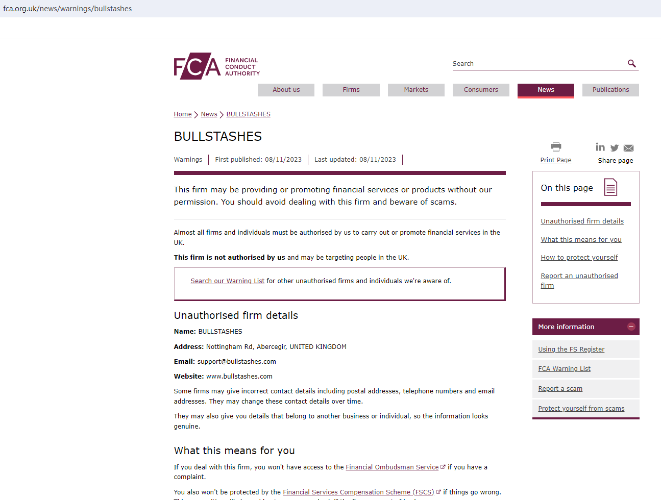 • Dec 28, 2023 The UK FCA issued a Warning against BULLSTASHES