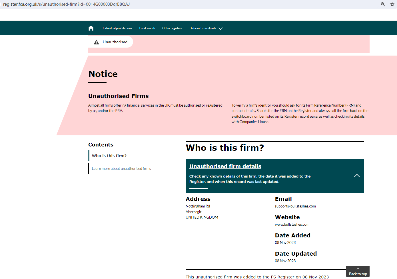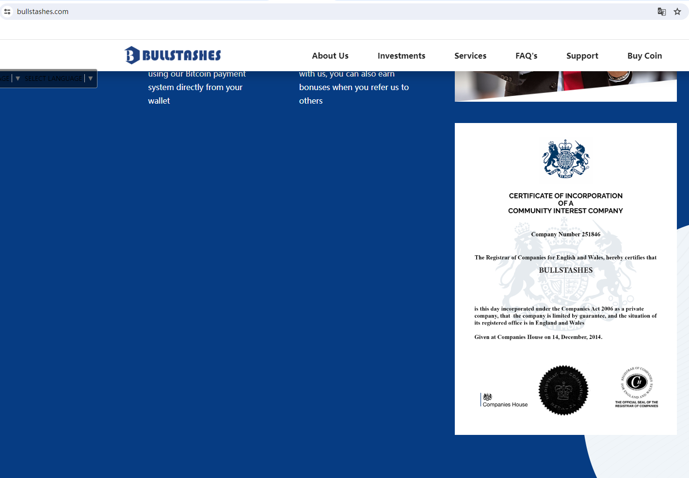 According to its website, it claims to be registered with Company House (CH) with the registration number 251846. Upon investigation, we found that the brand name corresponding to this number is "TOMLINSON & SMITH LIMITED", and the address is also inconsistent with that on the website. It can be seen from this that, It is likely that it has stolen other entity's registration information to deceive others.In addition, it is located in the UK, however, upon investigation, it was found that its registration status on the FCA was "Unauthorised".In essence, BULLSTASHES is not regulated by any governing body. Entrusting this broker with investors' funds is highly risky, as there are no legal protections in place to safeguard the funds.BULLSTASHES is unequivocally a scam.