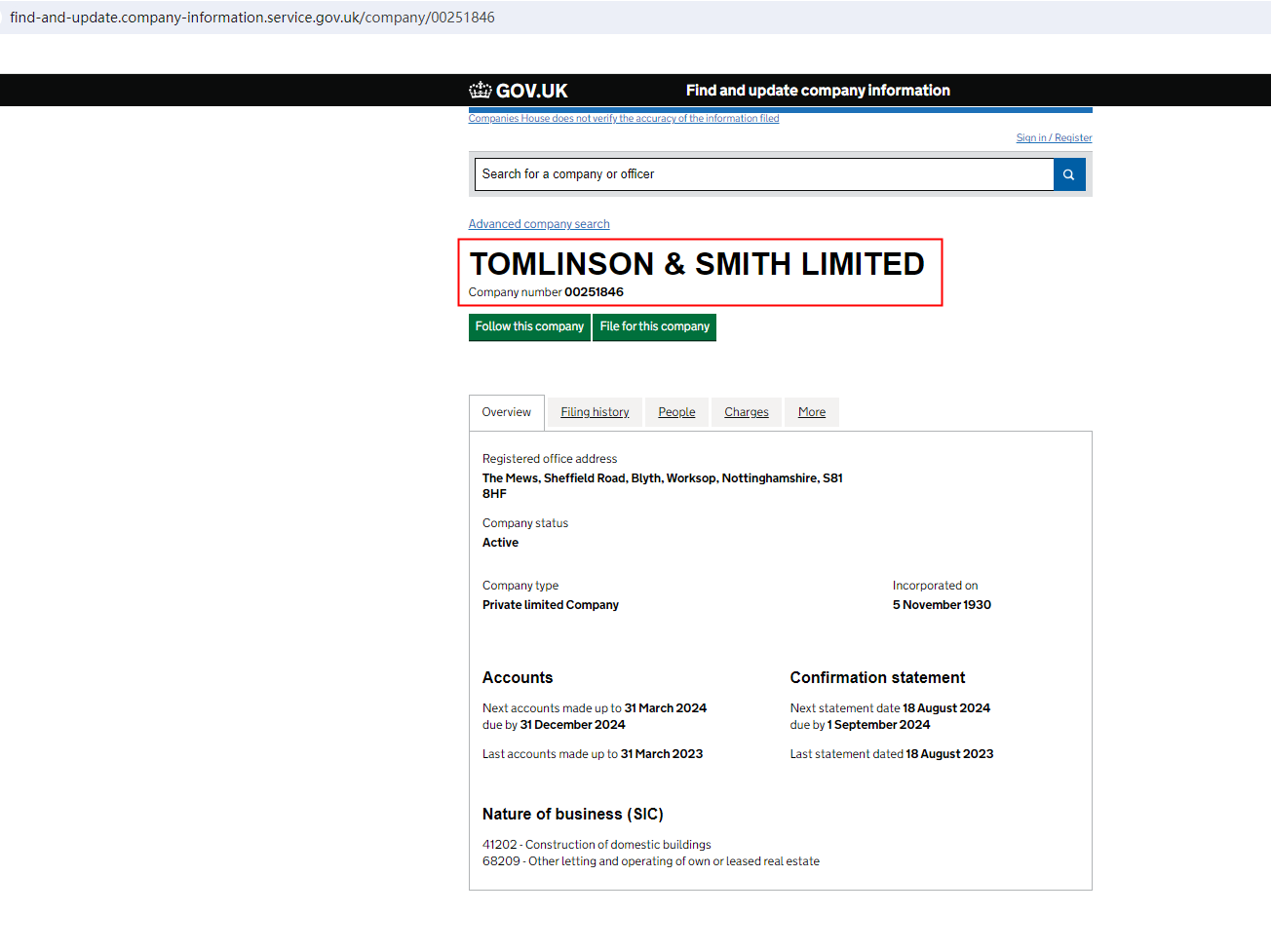 According to its website, it claims to be registered with Company House (CH) with the registration number 251846. Upon investigation, we found that the brand name corresponding to this number is "TOMLINSON & SMITH LIMITED", and the address is also inconsistent with that on the website. It can be seen from this that, It is likely that it has stolen other entity's registration information to deceive others.