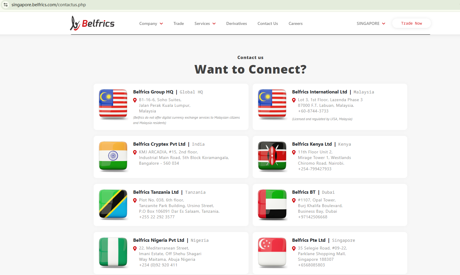 Belfrics has two websites to solicit investors. Information from the websites suggest that they have different branches across various countries. However, no information can be found indicating that the broker is properly registered or licensed. The Monetary Authority of Singapore (MAS) has added Belfrics to its warning list.