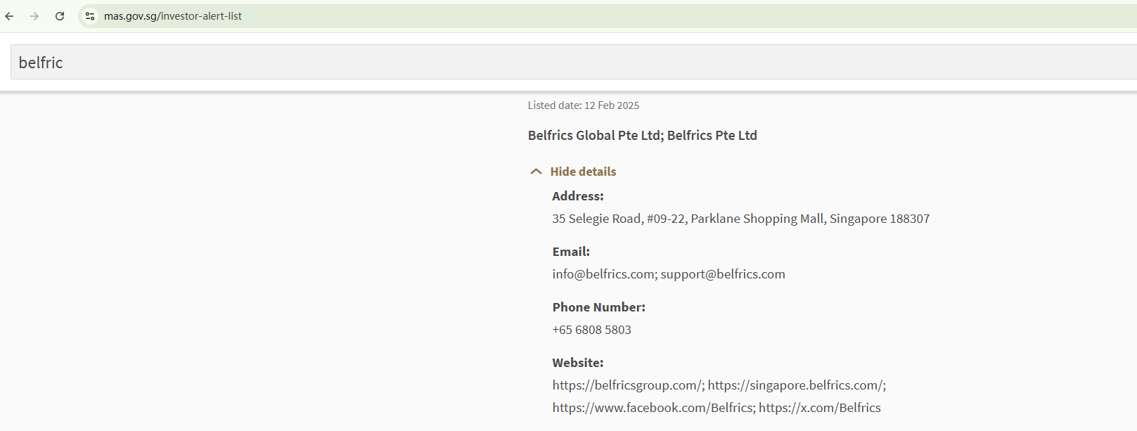 On February 12, 2025, the Monetary Authority of Singapore (MAS) added Belfrics to its warning list for providing investment services without being licensed. https://www.mas.gov.sg/investor-alert-list