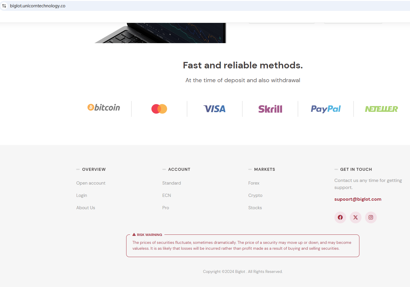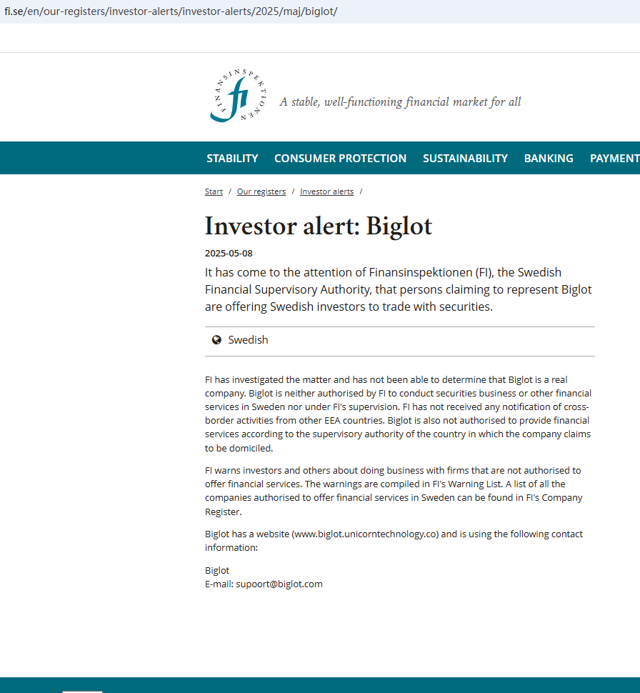 According to its website, it claims to be a reliable company, but it does not display any valid regulatory information on the website, and even the most basic office address is not disclosed, which is a very unreliable behavior. In addition, the Finansinspektionen (FI) issued a warning against Biglot, suspecting that it is not a real company. In essence, Biglot is not regulated by any governing body. Entrusting this broker with investors' funds is highly risky, as there are no legal protections in place to safeguard the funds. Biglot is unequivocally a scam.