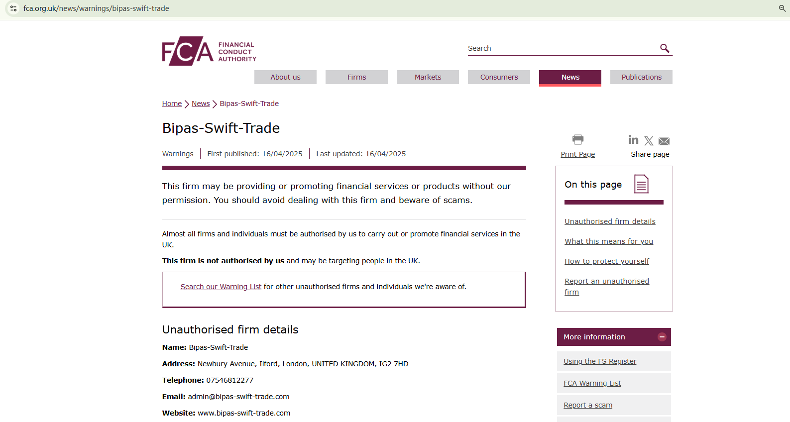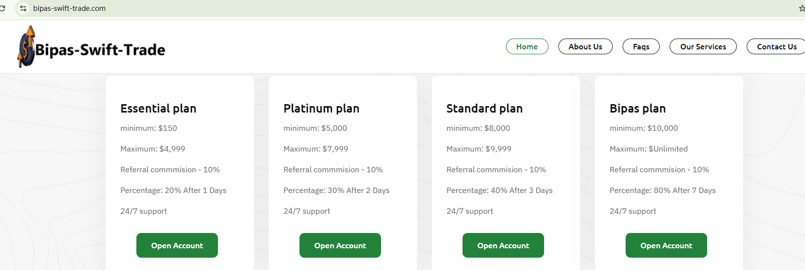 Bipas Swift Trade claims to be a forex broker. However, it doesn't provide any valid information to substantiate its legitimacy. The broker uses investment packages promising high returns to allure investors, which is a typical tactic employed by fraudsters. In addition, the Financial Conduct Authority (FCA) has issued a warning about Bipas Swift Trade for the lack of the required authorization.