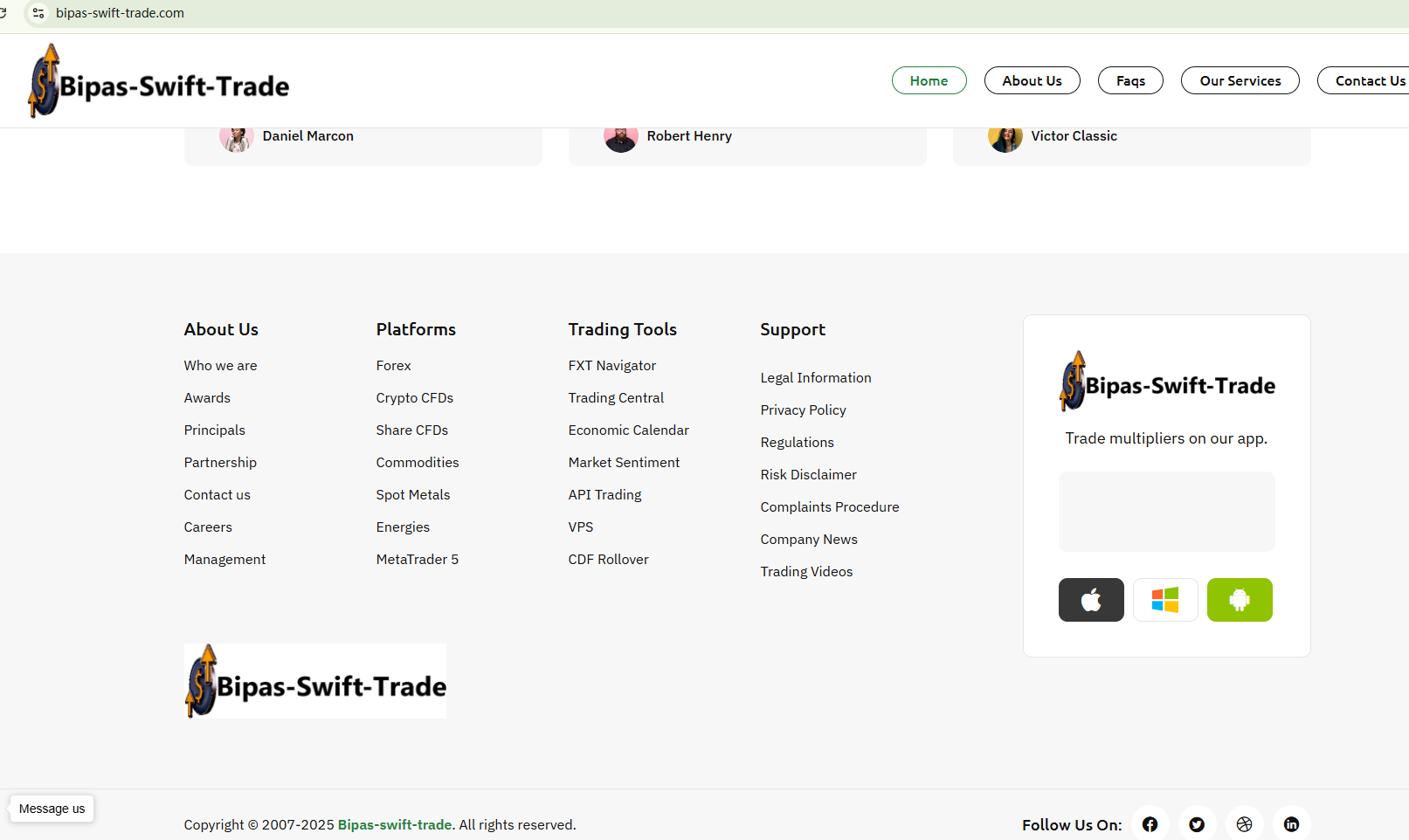 In essence, Bipas Swift Trade is not regulated by any governing body. Entrusting it with investors' funds is highly risky, as there are no legal protections in place to safeguard the funds. Bipas Swift Trade appears to be a scam.