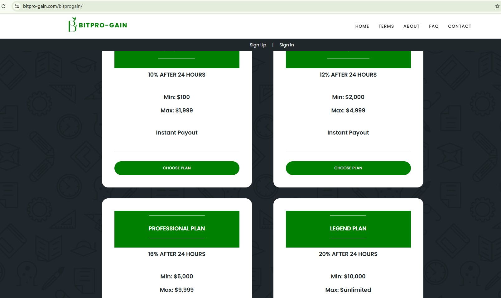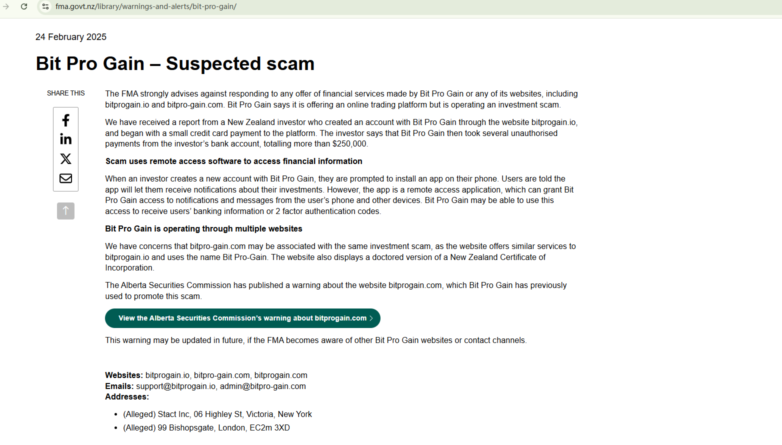 Bit Pro Gain operates through multiple websites: bitprogain.com, bitpro-gain.com, and bitprogain.io. The company promises unrealistic returns within a short time, a typical fraudulent tactic to lure unwitting investors. The New Zealand Financial Markets Authority (NZ FMA) has issued a warning, revealing this scam detailing how it works. Investors should be informed and avoid Bit Pro Gain.