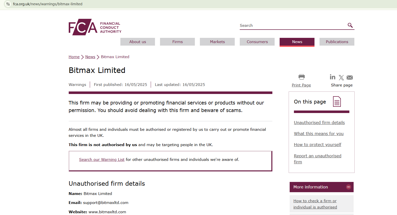 Bitmax Limited fails to disclose any useful information about its legal structures and regulatory status. This anonymity makes it challenging to hold it accountable. We find that Bitmax Limited promises fake returns to lure unsuspecting investors, a typical tactic used by fraudsters. While Bitmax Limited claims to be domiciled in the UK, the British major financial watchdog, the Financial Conduct Authority (FCA) has issued a warning against Bitmax Limited, advising investors to stay away from this unauthorized financial firm.