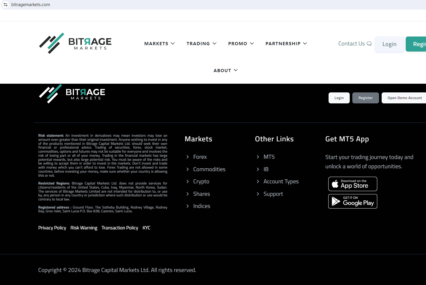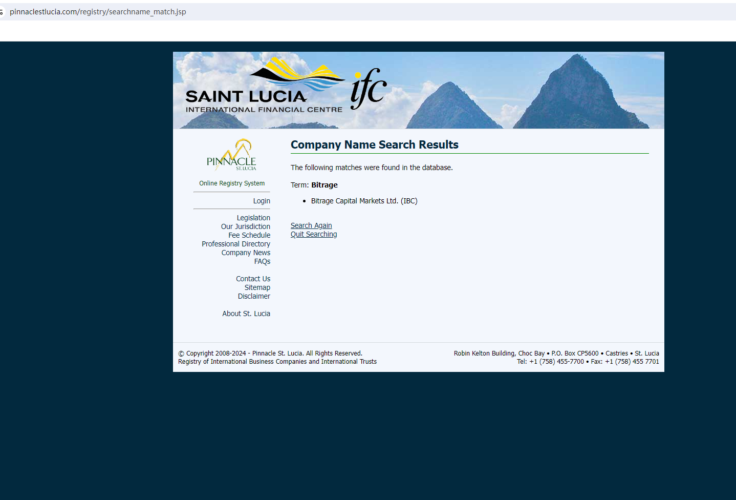 Bitrage Markets claims to be registered in St. Lucia, promoting this registration as proof of its legitimacy. However, forex trading activities are not licensed in St. Lucia. Therefore, Bitrage Markets is not regulated at all. Entrusting it with investors' funds is highly risky, as there are no legal protections in place to safeguard the funds.